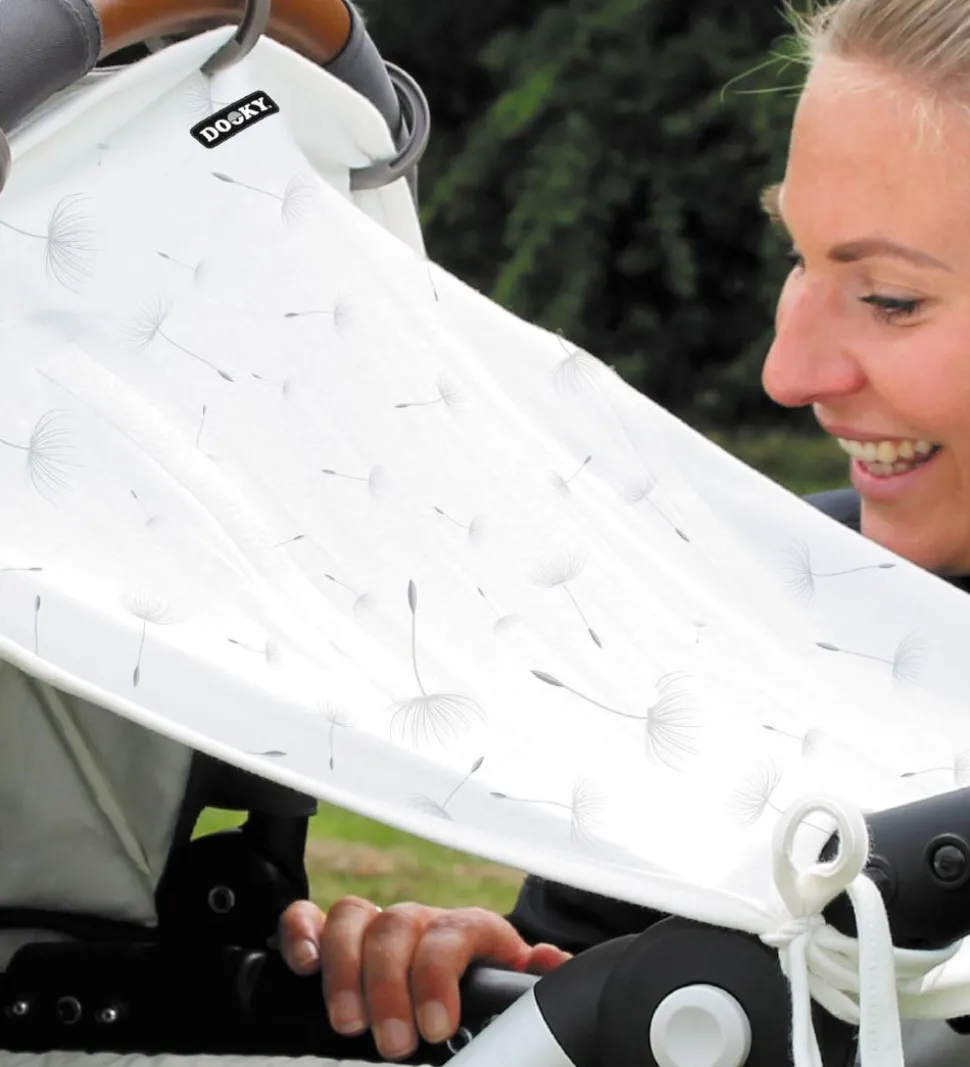 Dooky solsejlet beskytter mod vind, solens UV-stråler, lys, kulde og let regn. Skærmen kan monteres på de fleste barnevogne, klapvogne og autostole med de 5 medfølgende ringe. Solskærmen kan justeres i længden ved at rulle det op eller ned. Solsejlet hjælper også med at holde en behagelig temperatur for barnet inde i vognen.
