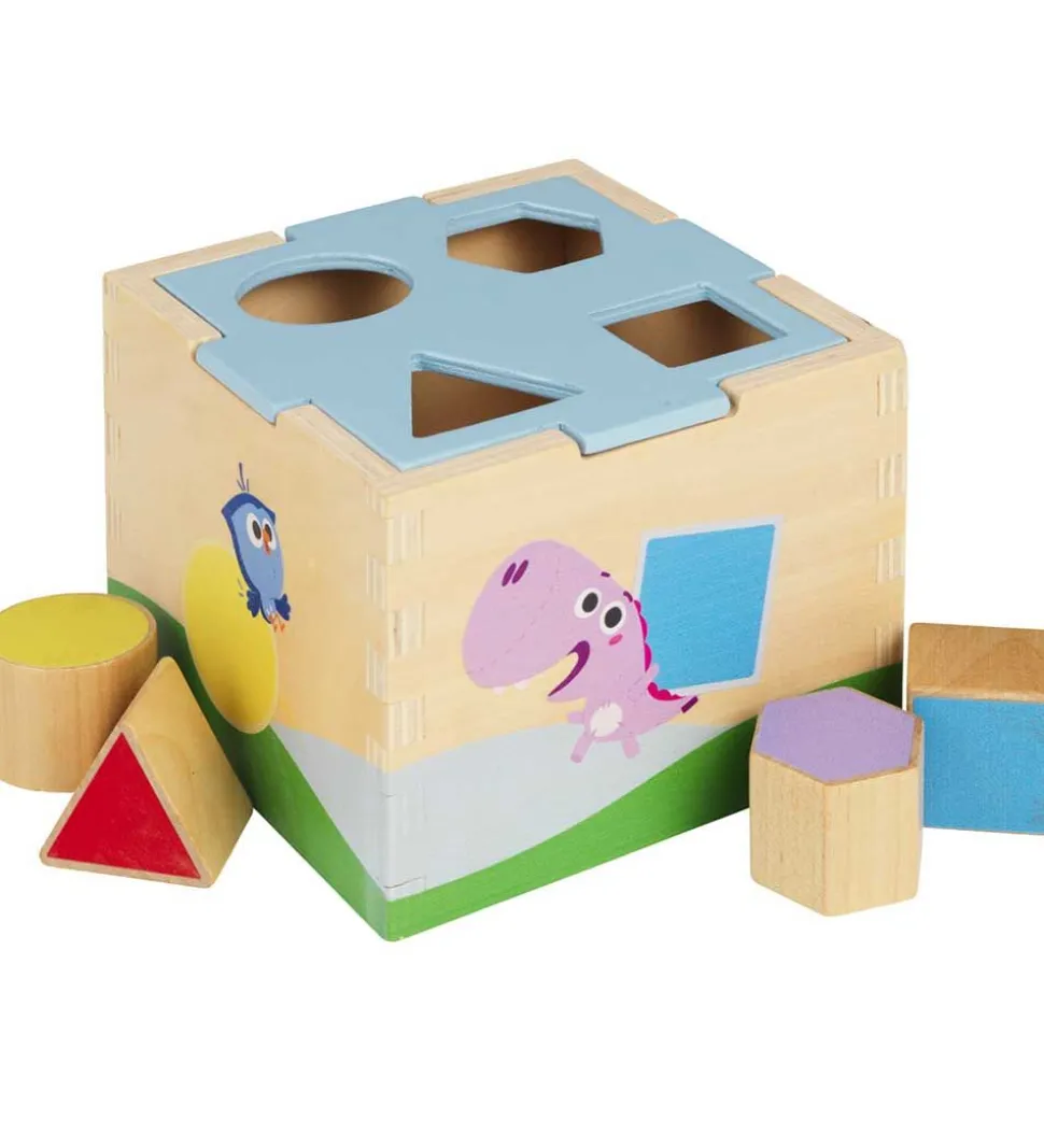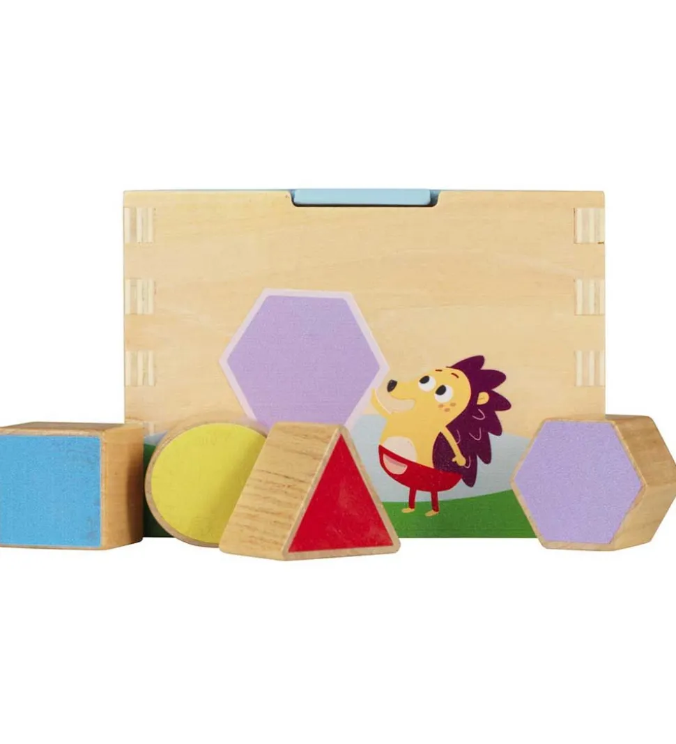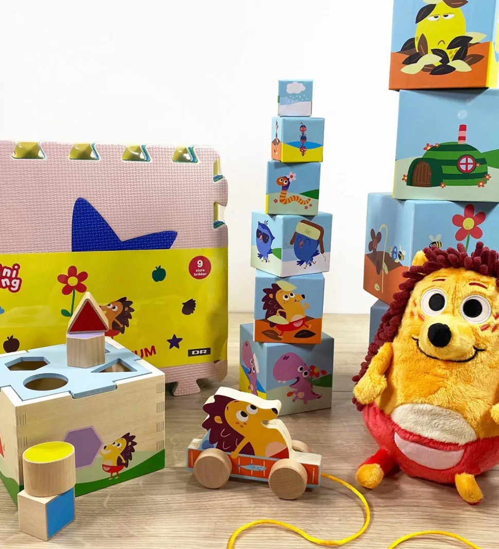 DR puttekassen har en kvadratisk form med fire huller i toppen, hvert med sin egen udformning. Formerne er en cirkel, en firkant, en trekant og en sekskant, med klodser i matchende former. Låget af puttekassen tages let af, når klodserne skal tages op ad kassen igen.