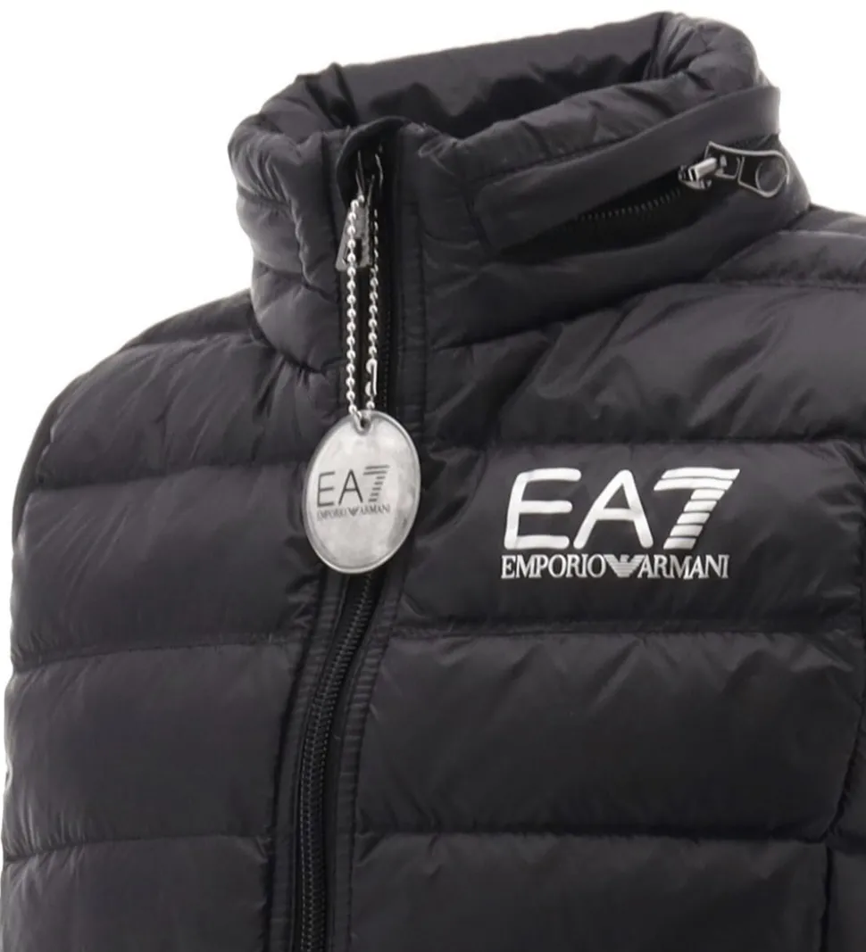EA7 dunvesten har en høj hals og smalle, elastiske kanter. Den har en fast hætte, som kan gemmes væk i en lynlåslomme i kraven. Dunvesten åbnes med en lynlås med hagebeskytter og indvendig vindstolpe. I siderne er der praktiske lommer, som lukkes med en skjult lynlås. Dunjakken har et glatvævet for, og den er vatteret med lune dun og fjer.