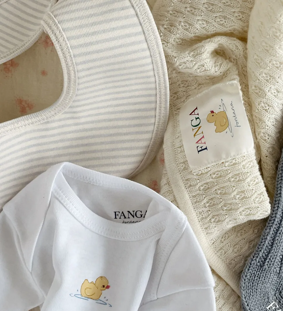 Funktionelle Fanga Fontana savlesmække i en pakke med to. Den ene har et diskret, stribet mønster i lyseblå og hvid, mens den anden er ensfarvet cremehvid med et tryk af to katte.