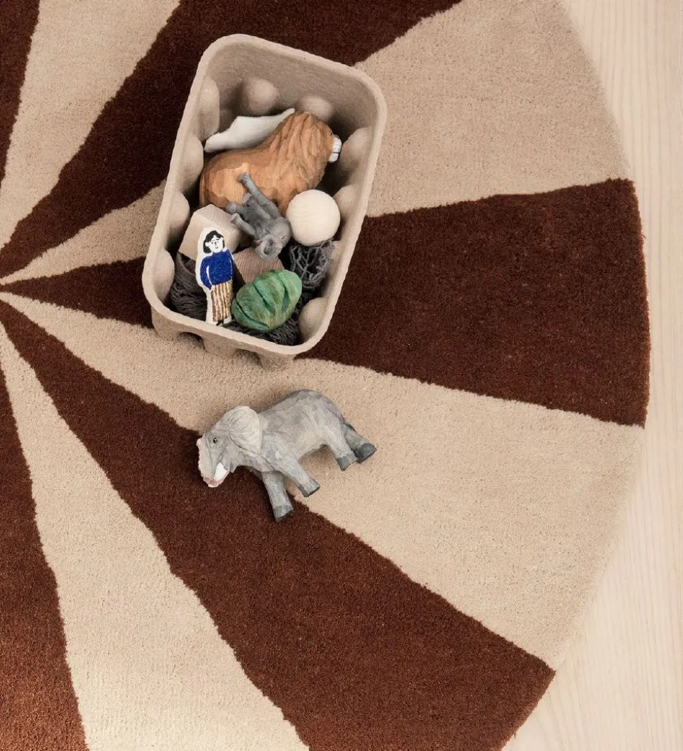 ferm Living gulvtæppet er rundt, og det er lavet af tykt og blødt uld på oversiden, og på undersiden er det lavet af bomuld. Tæppet er super lækkert til børneværelset, legehjørnet eller stuen, hvor det luner små fødder.