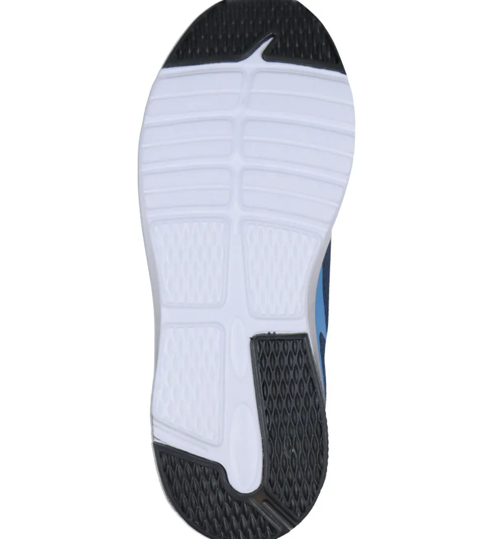 Smarte Fila sko i mørkeblåt mesh med hvide logoer og detaljer i blå og hvid. Ydersålerne graduerer i farven fra mørkegrå til hvid.