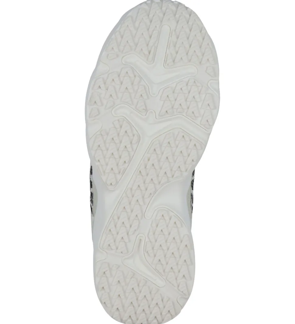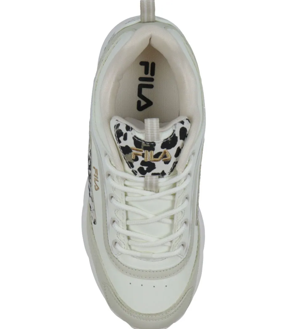 Smarte Fila sko i hvidt og beigefarvet, imiteret skind med detaljer af cremefarvet ruskind med et sort leopardmønster.