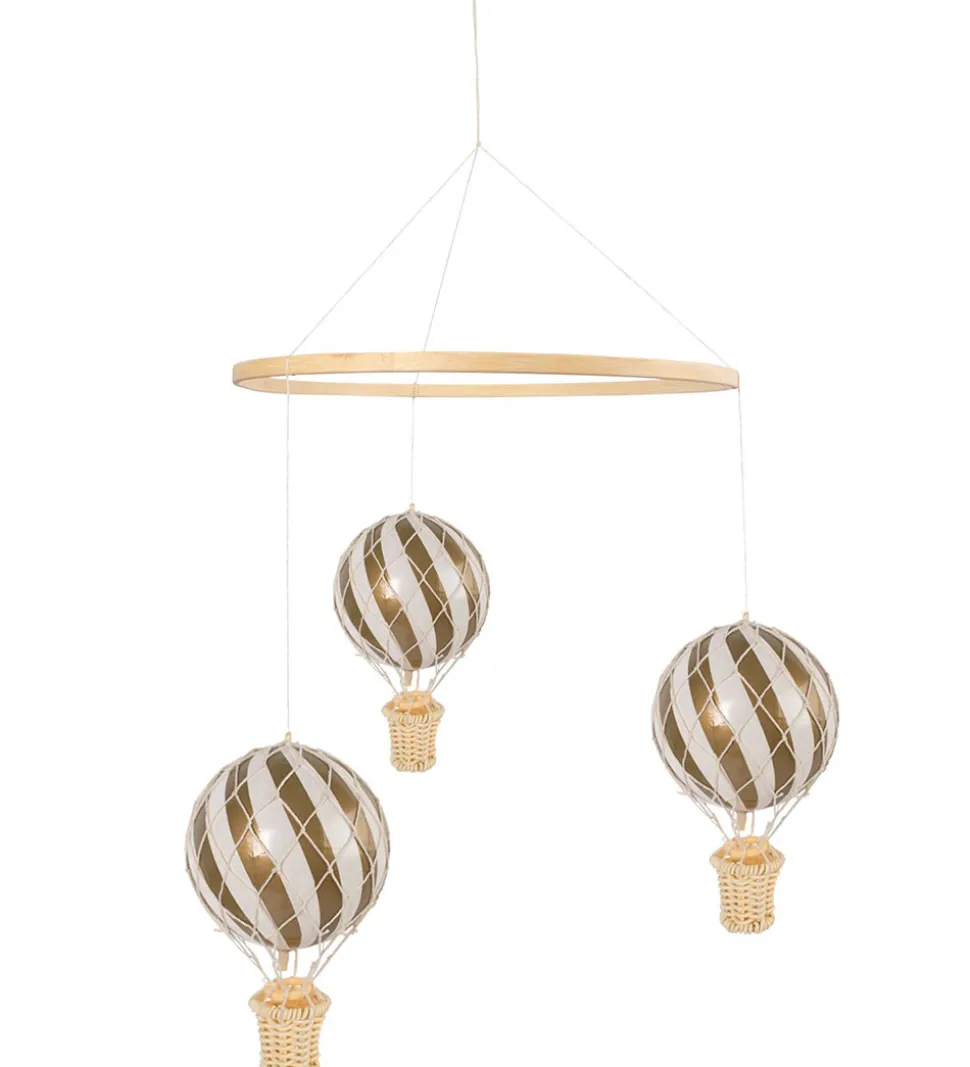 Smuk Filibabba uro med tre luftballoner i hvid med gyldne striber og med en flettet kurv nedenunder.