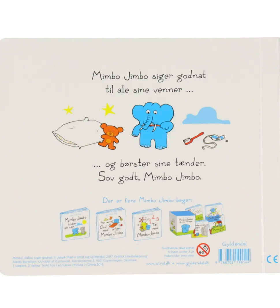 Gyldendal bogen er en flot papbog med tykke sider til de mindste. Mimbo Jimbo siger godnat til alle sine venner, læser godnat historie, og husker at børste sine tænder. Her kan barnet børste tænder med Mimbo Jimbo – da der følger en tandbørste med. På tandbørsten er et motiv af Mimbo Jimbo.