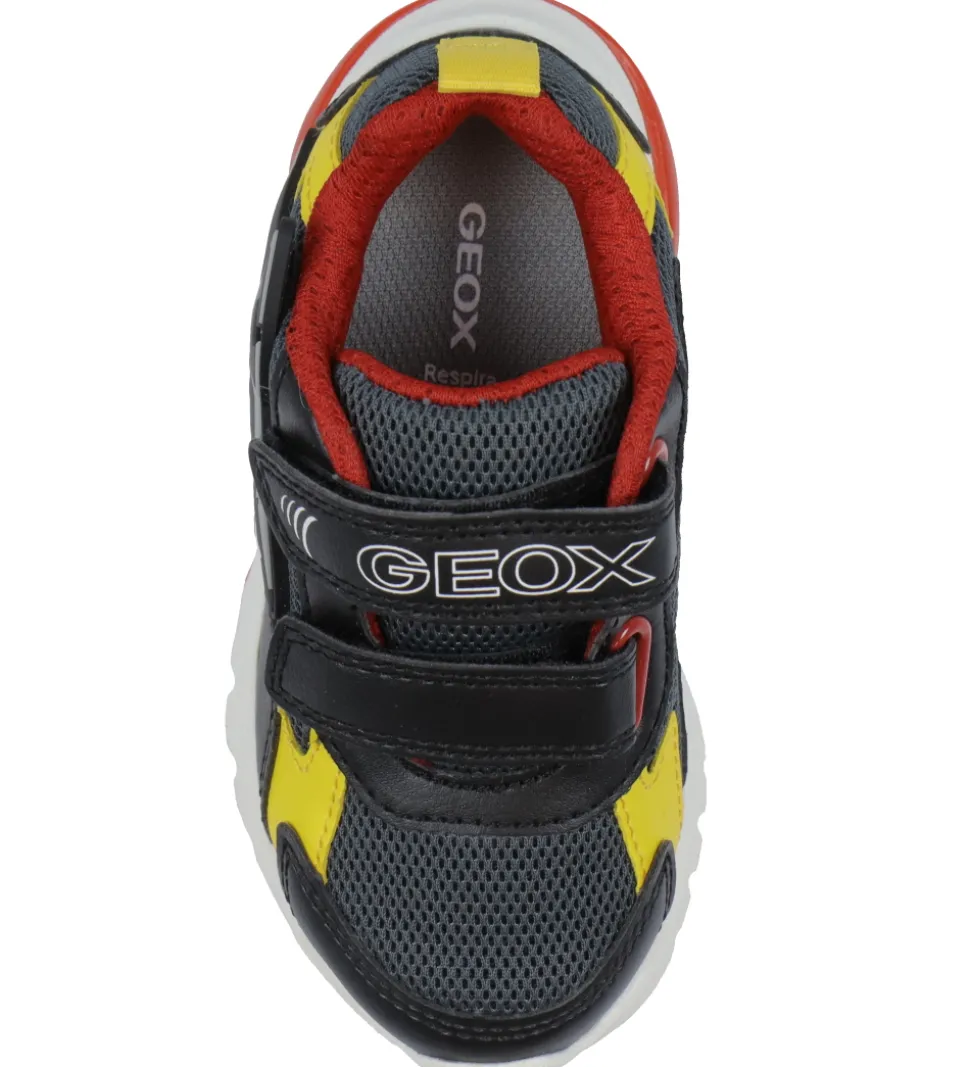 Smarte Geox blinkesko i mørkegrå mesh og sort imiteret skind med en 3D-applikation af en haj på ydersiden og med detaljer i rød og gul. Skoene har indbygget LED-lys i ydersålerne, som aktiveres når man går. Lyset kan slukkes og tændes på siden og er ikke genopladeligt.