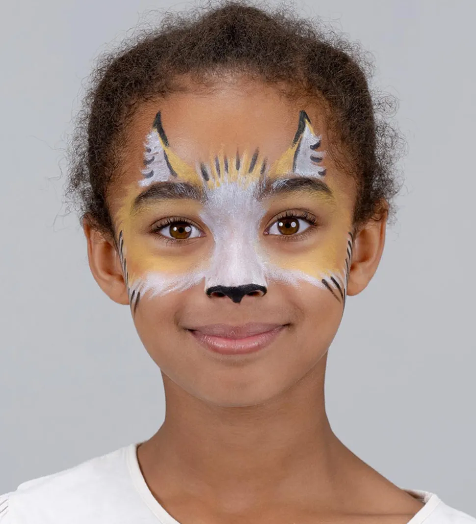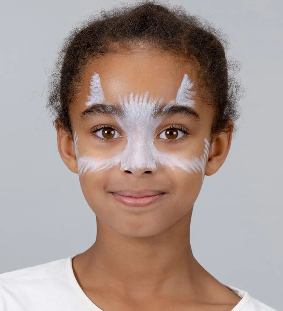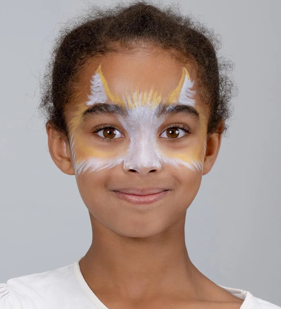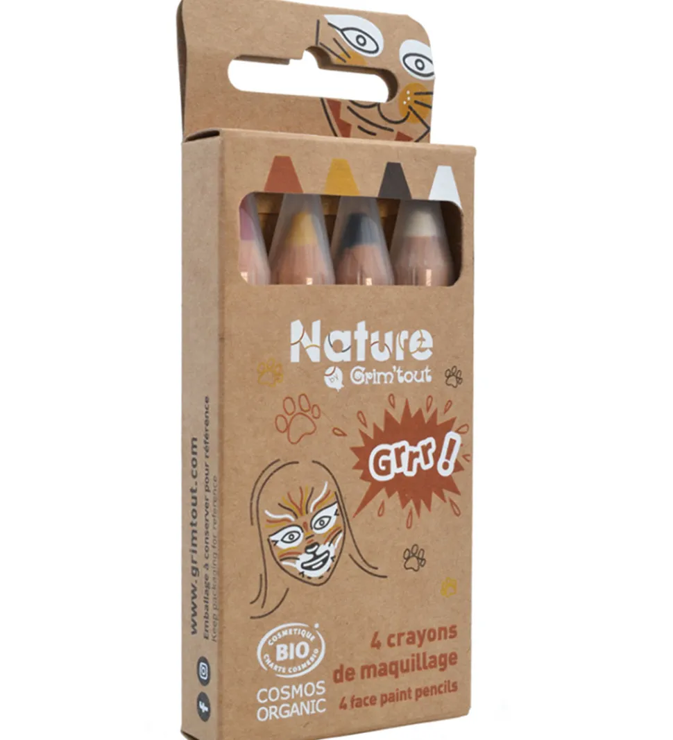 Sjovt Grim Tout teatersminke i en pakke, der indeholder 4 farveblyanter i farverne brun, gul, sort og hvid.