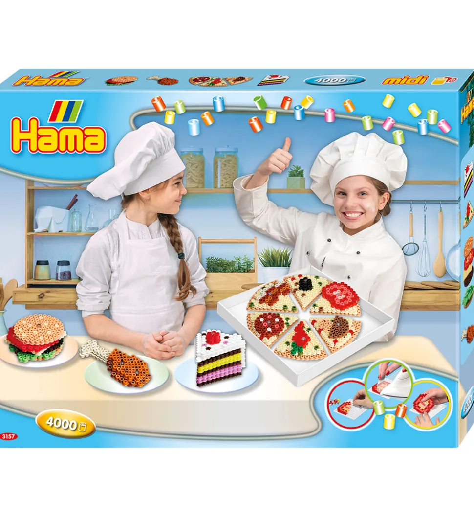 Hama perlesættet kommer i en fin papkasse, og indeholder: