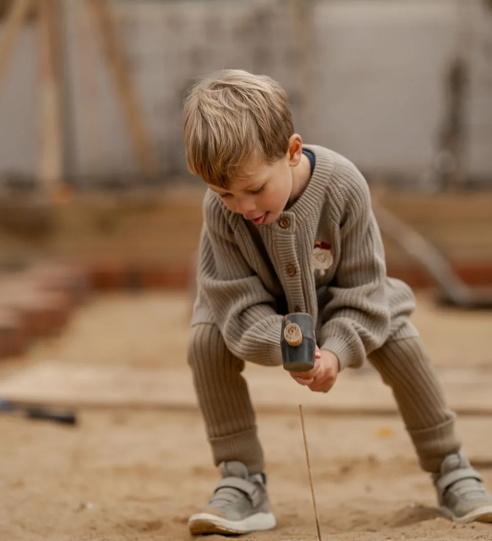 Flot cardigan i en flot brun nuance med grønt skær. Blusen har en broderet hane på venstre bryst og en strikket ribstruktur. Dem har en rund halsudskæring og gennemgående knapper fortil.