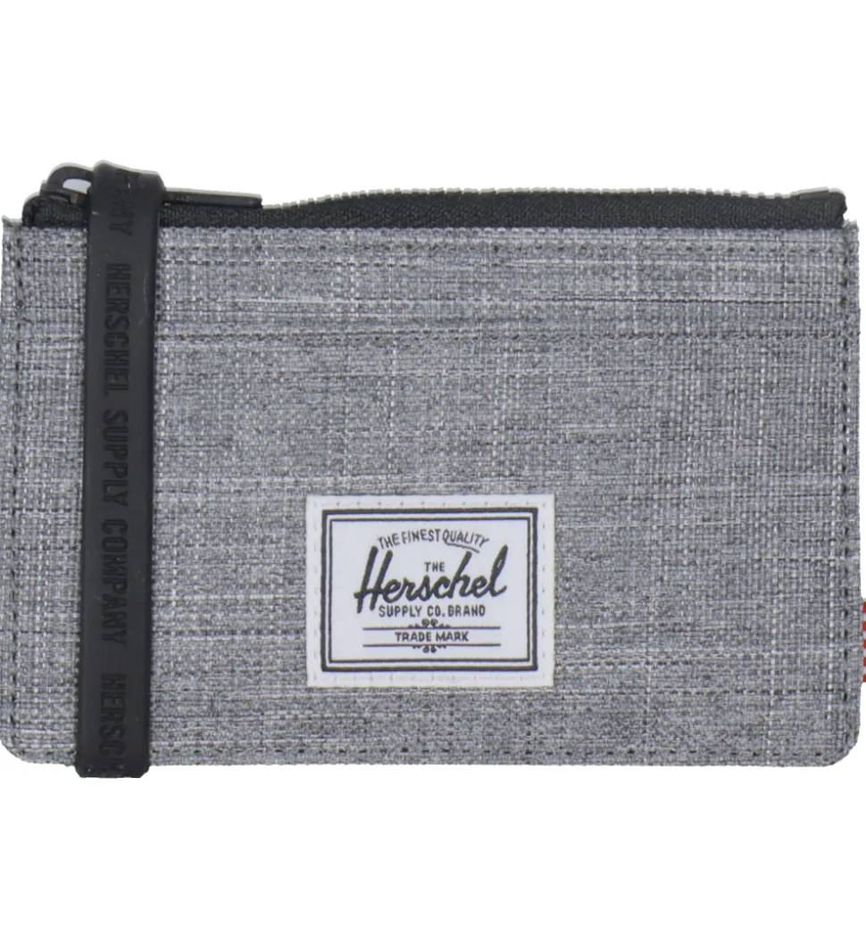 Flot Herschel kortholder i meleret grå med sorte detaljer med en hvid logopatch fortil. Indvendigt har den et stribet for, som matcher dens ydre.