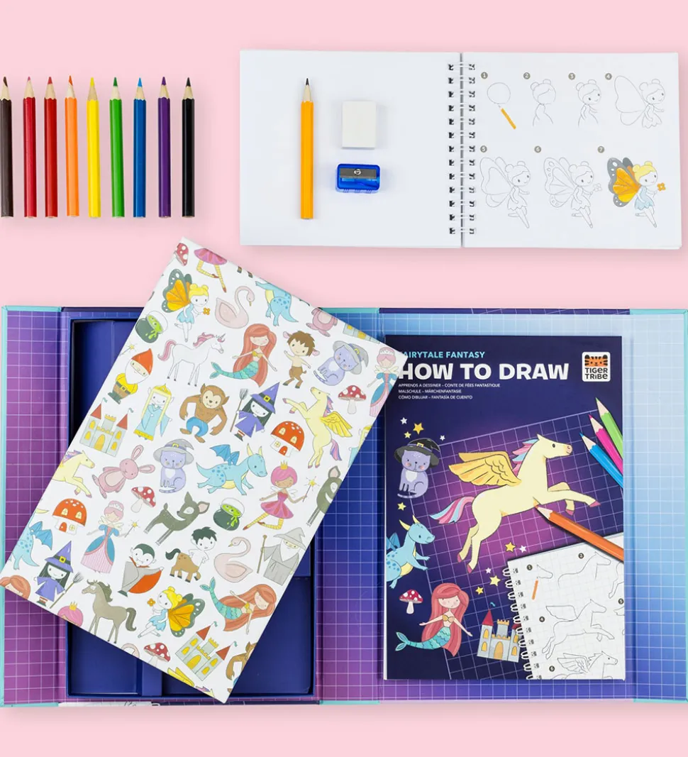 Tiger Tribe tegnesættet lærer dig at tegne flotte tegninger. Det består af en praktisk opbevaringsæske med en blyant samt 9 farveblyanter, et viskelæder og en blyantspidser, en bog med trin for trin-vejledninger til 24 forskellige dyr samt en ternet skitseblok med 36 sider.