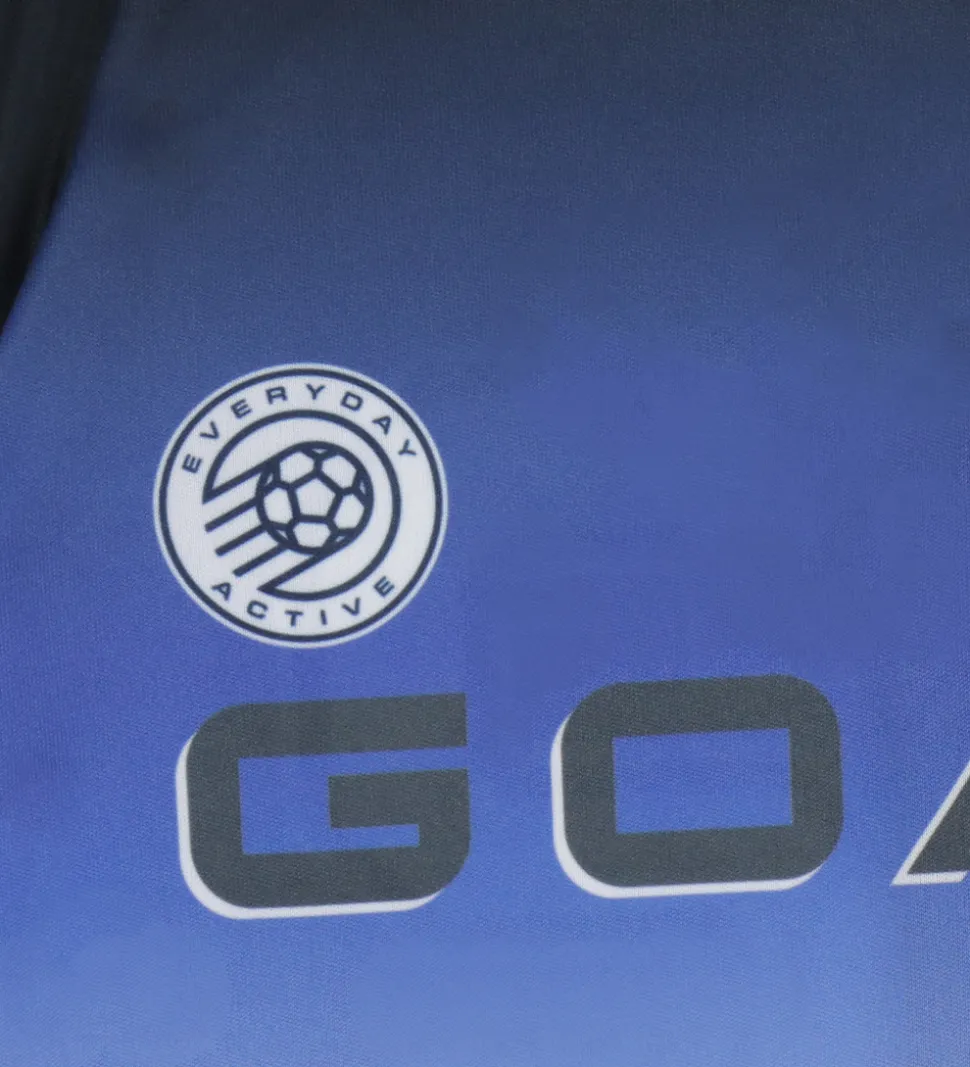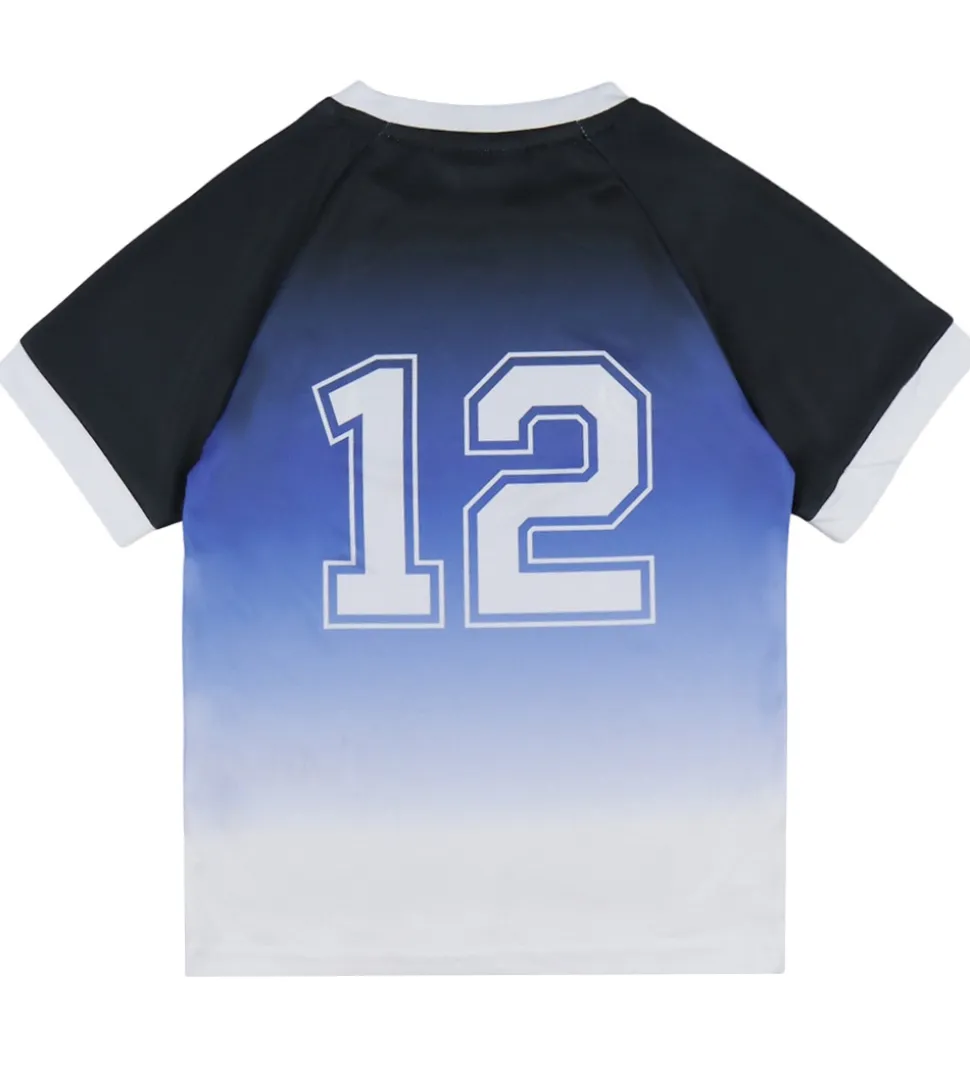 Smart Hummel træningssæt bestående af en t-shirt og et par shorts. Træningssættet har en flot farveovergang fra sort til hvid med blå detaljer og med “GOAL” trykt på t-shirten samt et “12” tryk.
