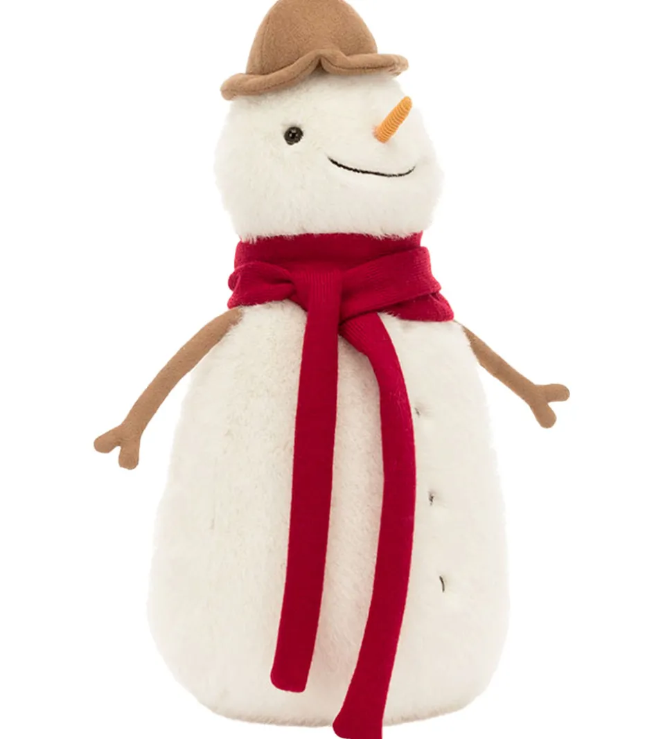 Festlig Jellycat bamse formet som snemanden Jesse i hvidt plys med en brun hat og arme samt et rødt halstørklæde.