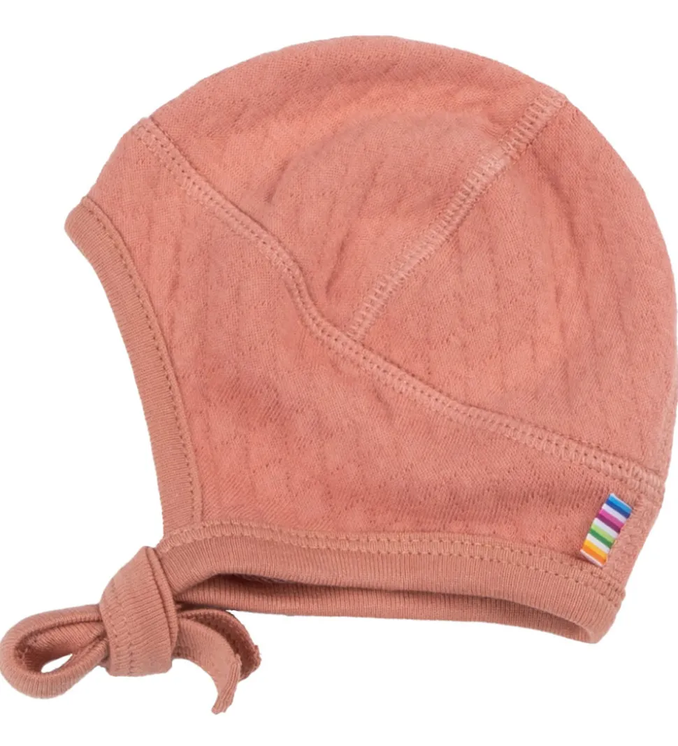 Lækker Joha babyhjelm i en smuk laksefarve. Hjelmen er designet med fine detaljer og sikrer komfort og varme til de små.