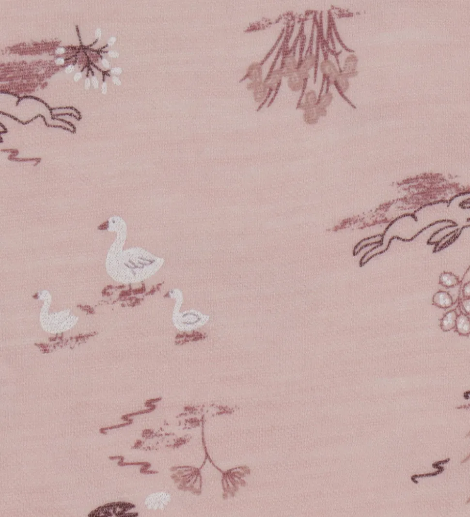 Charmerende Joha babyhjelm i en blød, rosa nuance med et fint mønster af dyr og blomster. Babyhjelmen er lavet af let stof, der sikrer en god pasform.