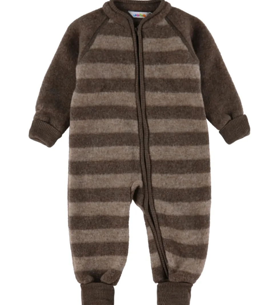 Flot Joha køredragt med vandrette striber i brune nuancer og ensfarvede ærmer. Køredragten har lynlås fra hagen til venstre fod. Den har lange ærmer og lange ben med brede ribkanter. Køredragten er fremstillet i en kraftig kvalitet i merinould.