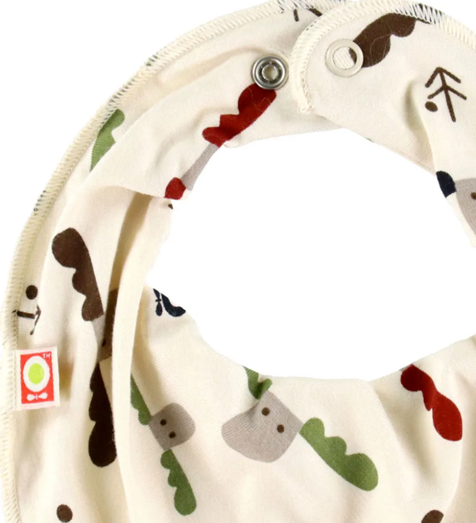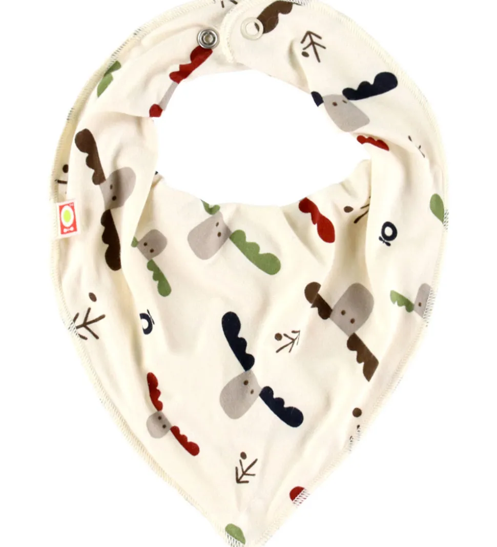 Skøn Katvig savlesmæk i råhvid med alloverprint af elgehoveder og logoer i forskellige farver. Savlesmækken har en trekantet facon, og lukkes i nakken med en trykknap med to indstillinger.