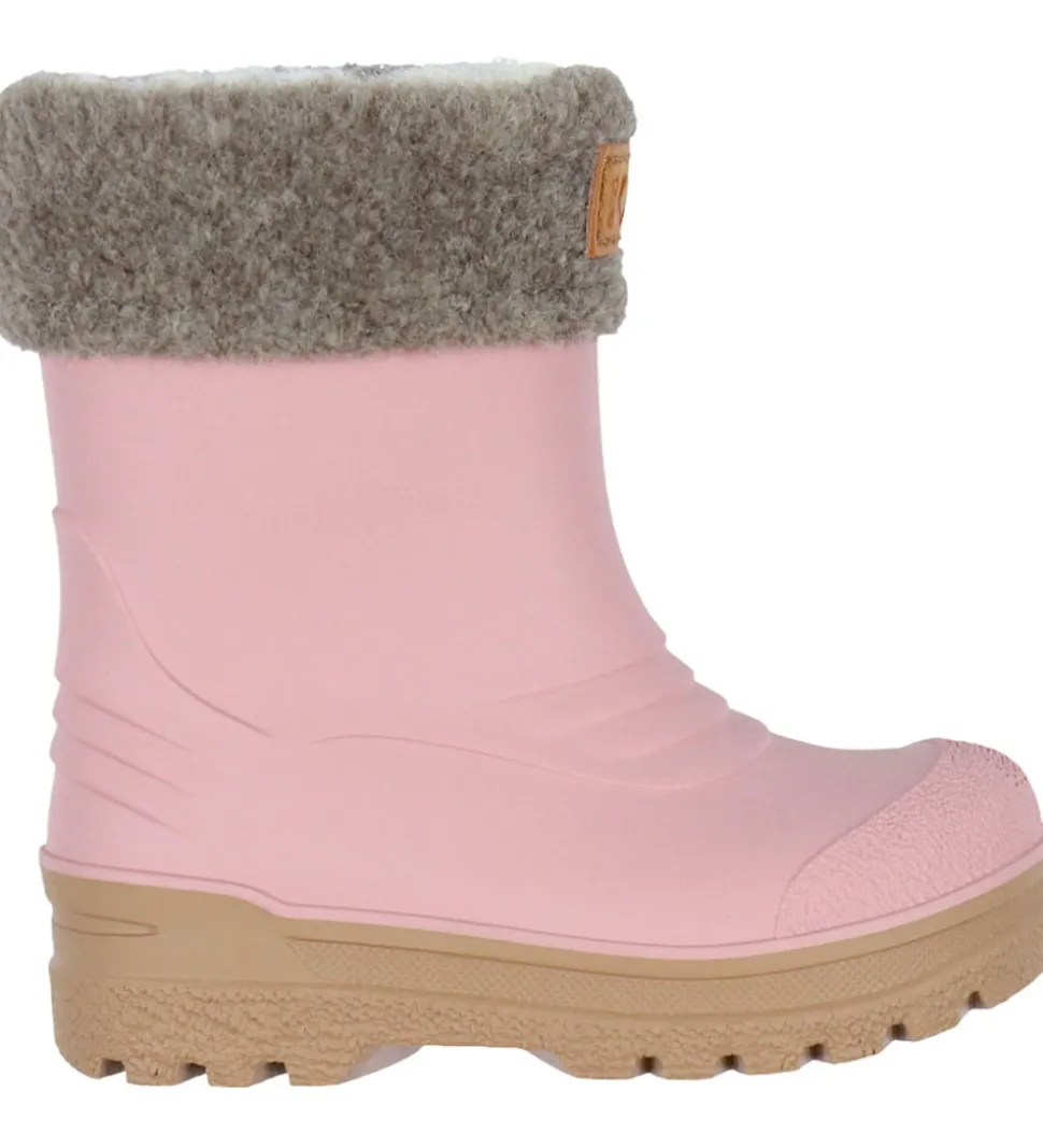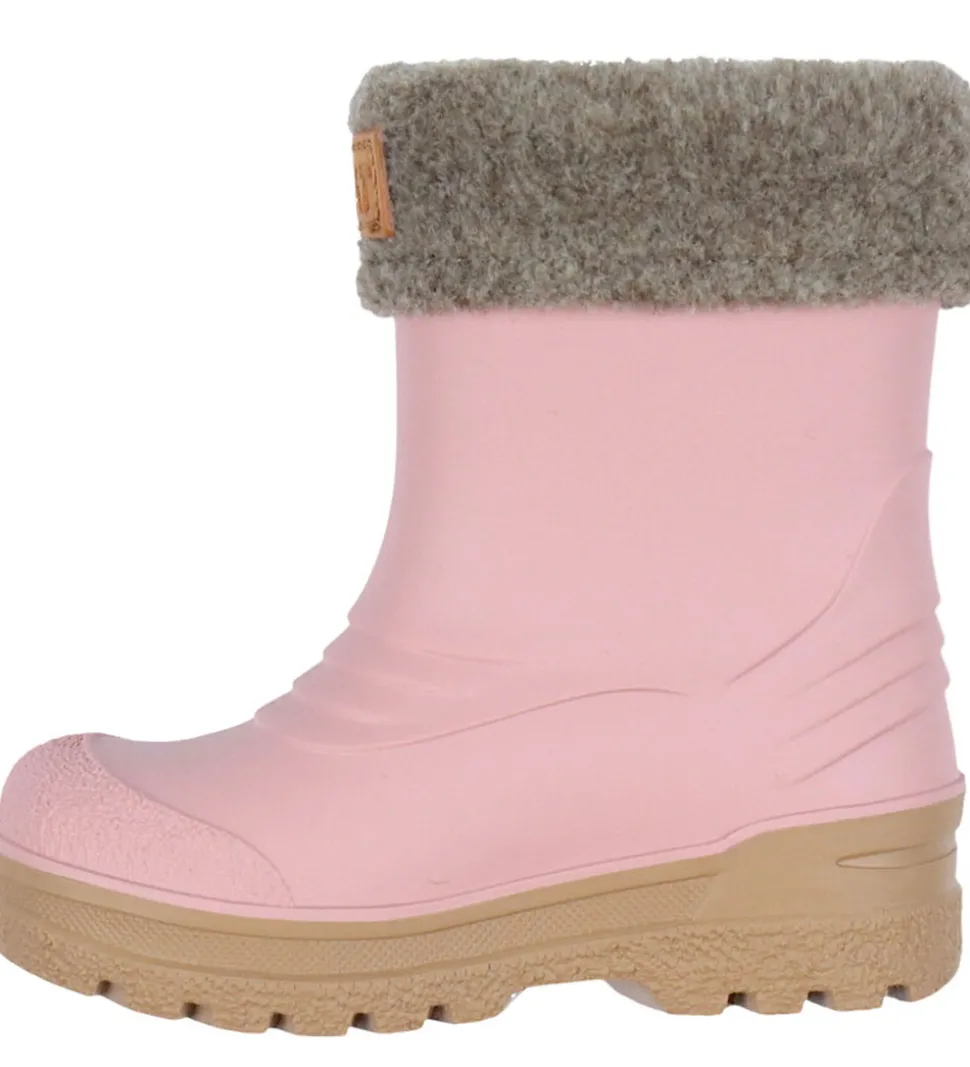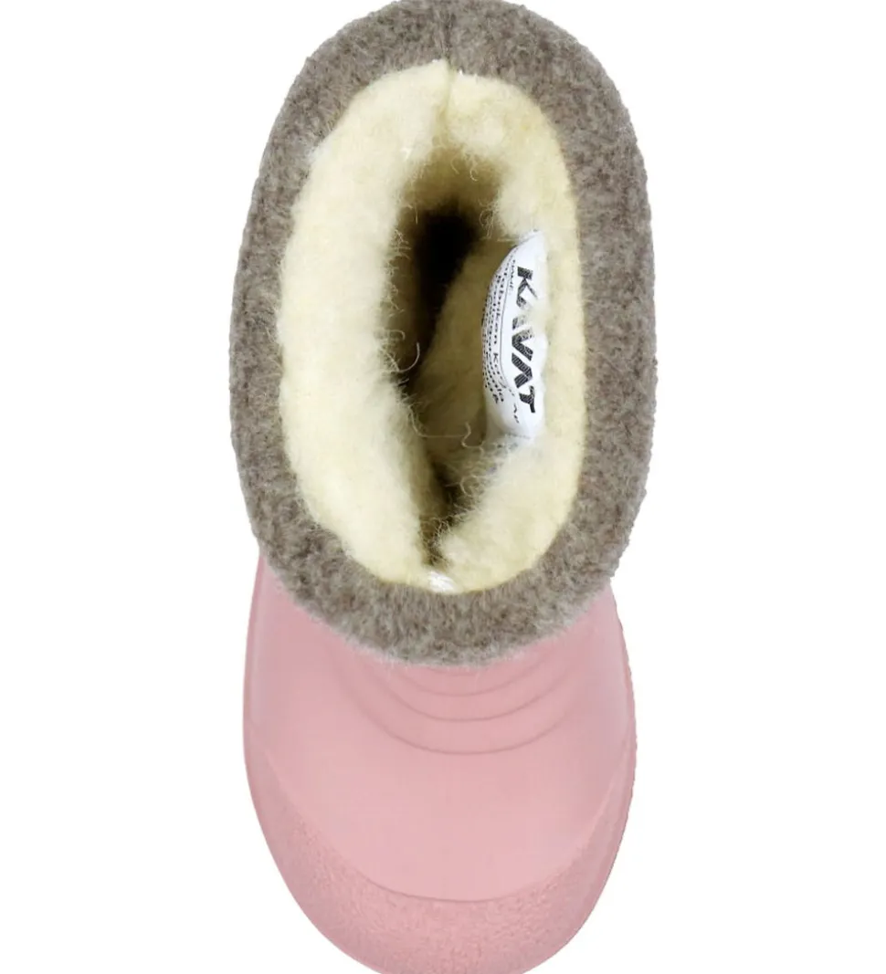 Skønne Kavat gummistøvler i rosa med en brun kant af uld i toppen og med brune ydersåler.