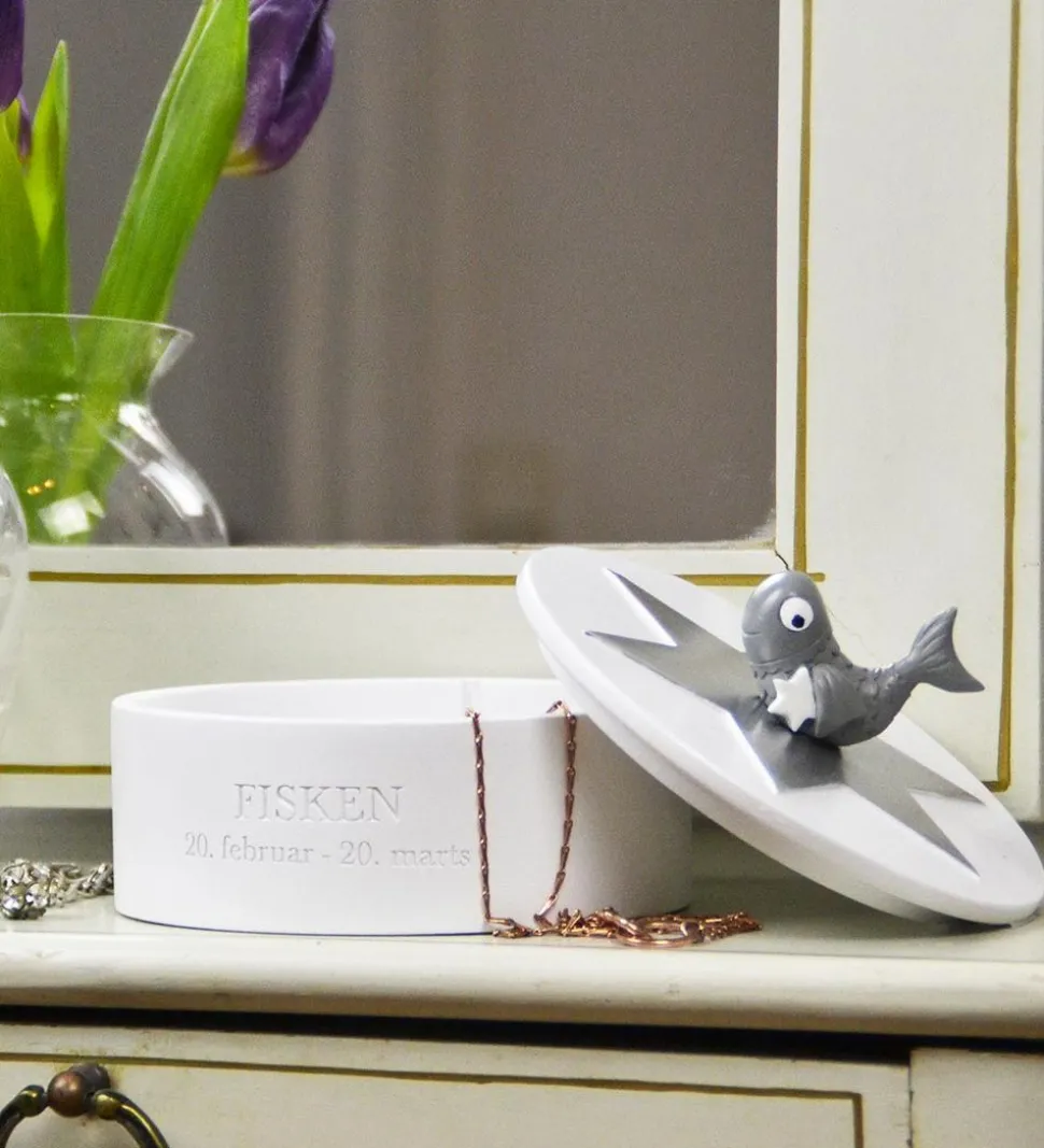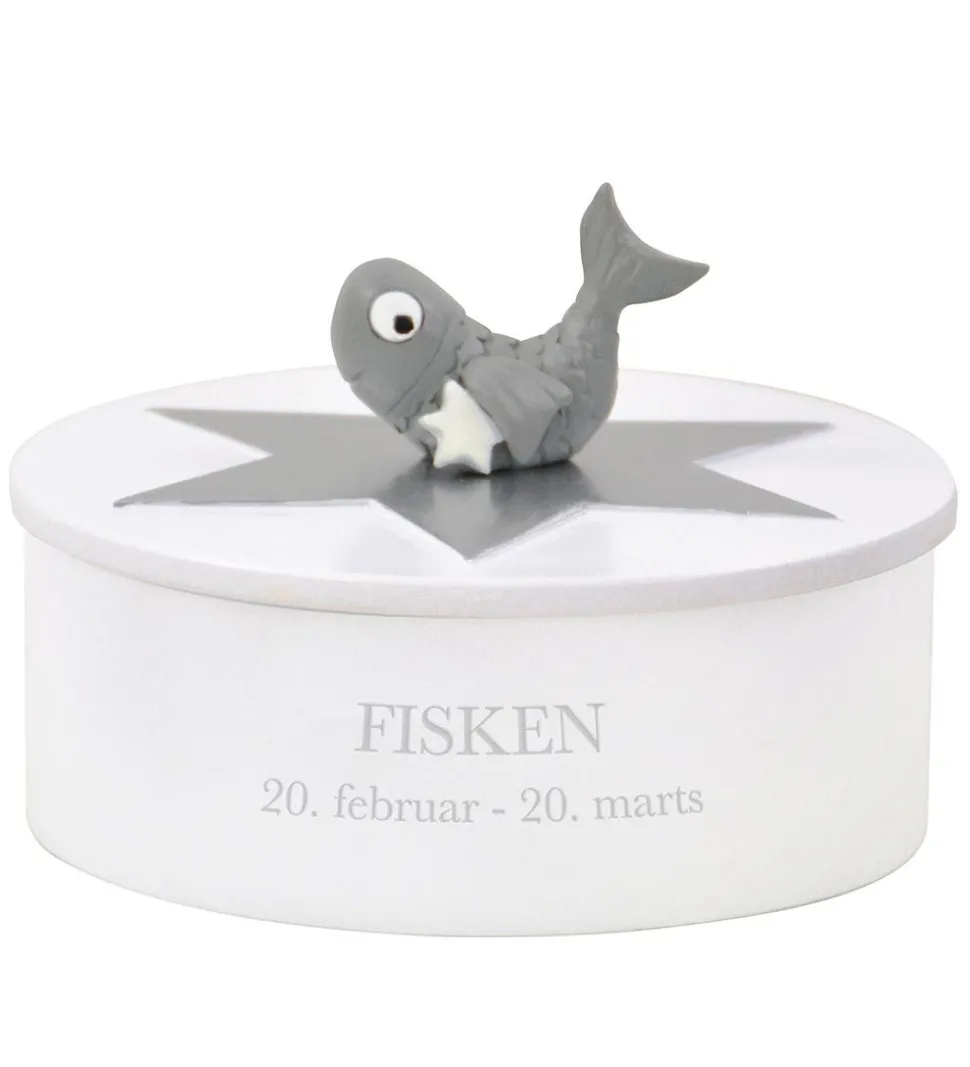 Flot Kids by Friis smykkeskrin i hvid med stjernetegnet Fisken. Ovenpå sidder en en sød figur, som skal illustrere stjernetegnet, og figuren holder en stjerne, der lyser i mørke. Fortil står der skrevet “FISKEN” og stjernetegnets periode.