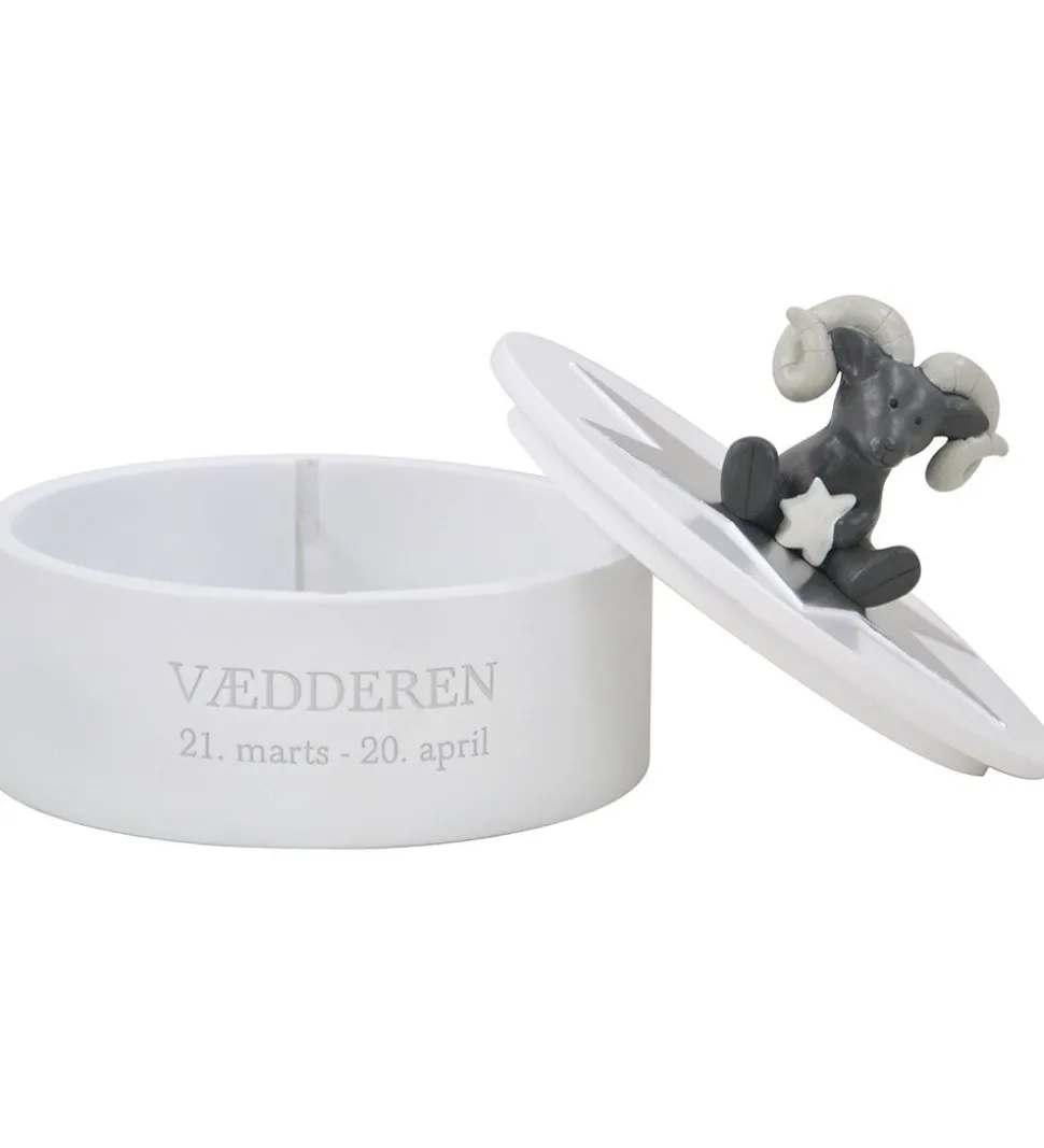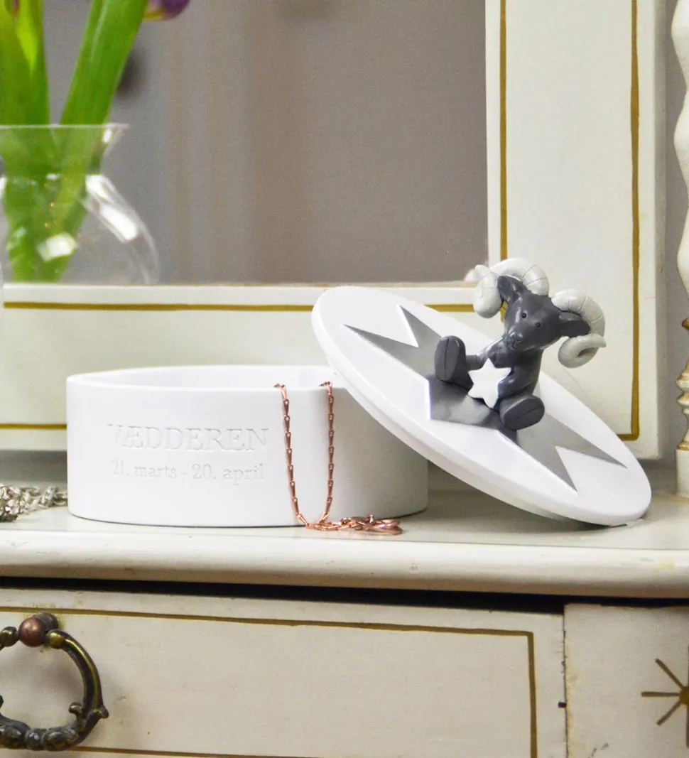 Flot Kids by Friis smykkeskrin i hvid med stjernetegnet Vædderen. Ovenpå sidder en en sød figur, som skal illustrere stjernetegnet, og figuren holder en stjerne, der lyser i mørke. Fortil står der skrevet “VÆDDEREN” og stjernetegnets periode.
