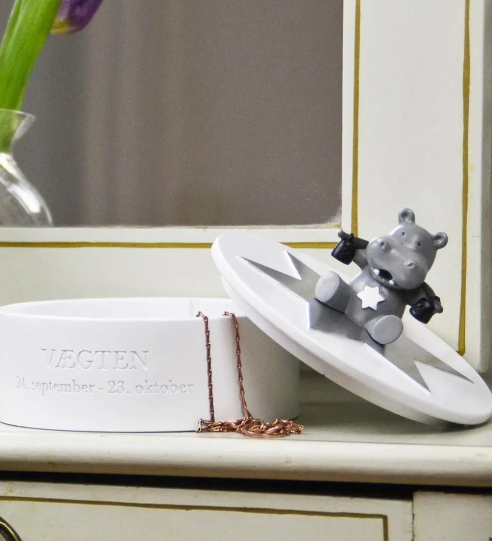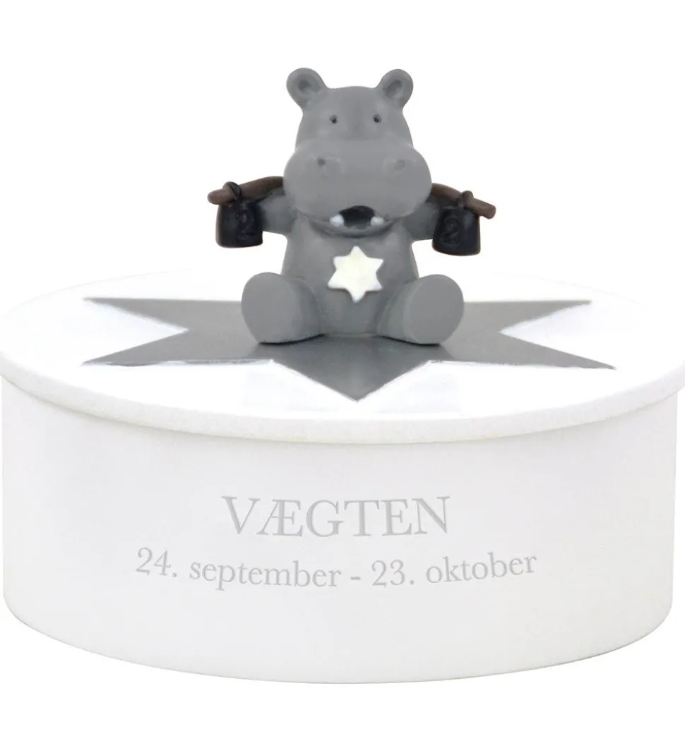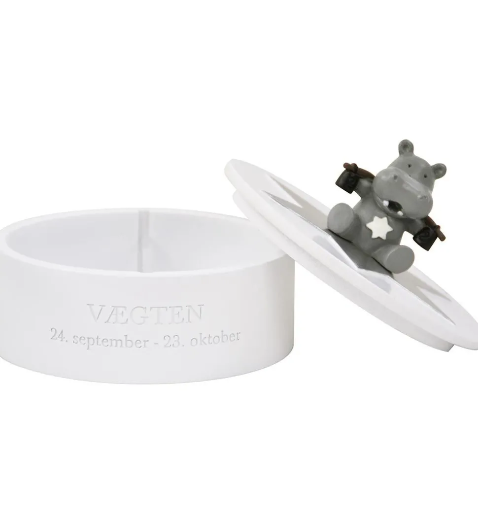Flot Kids by Friis smykkeskrin i hvid med stjernetegnet Vægten. Ovenpå sidder en en sød figur, som skal illustrere stjernetegnet, og figuren holder en stjerne, der lyser i mørke. Fortil står der skrevet “VÆGTEN” og stjernetegnets periode.