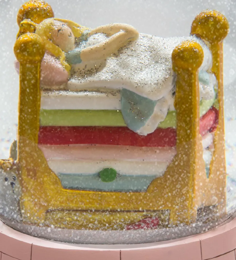 Sød Kids by Friis snekugle med en bund i lyserød og med et fint mønster, så det ligner mursten. På fronten er der en lille brun dør med en guldkrone på. Inde i snekuglen ligger prinsessen på ærten i en guldseng med masser af madrasser.