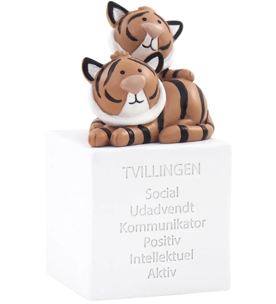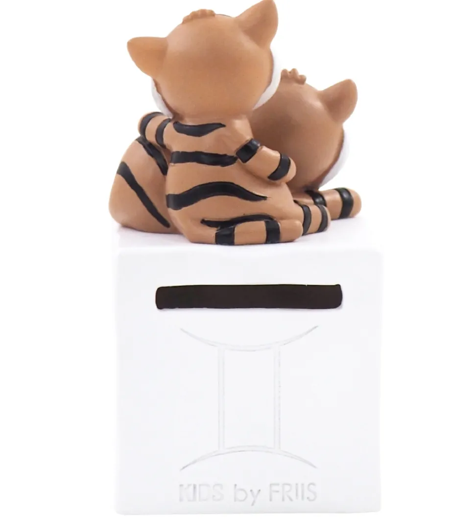Skøn Kids by Friis sparebøsse med stjernetegnet Tvillingerne. Der er en sød figur, som skal illustrere stjernetegnet, oven på selve sparebøssen, der er udformet som en hvid kube.