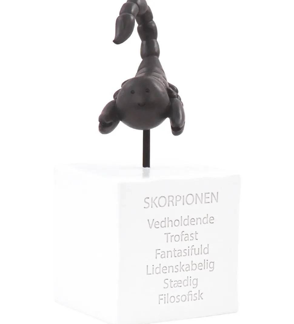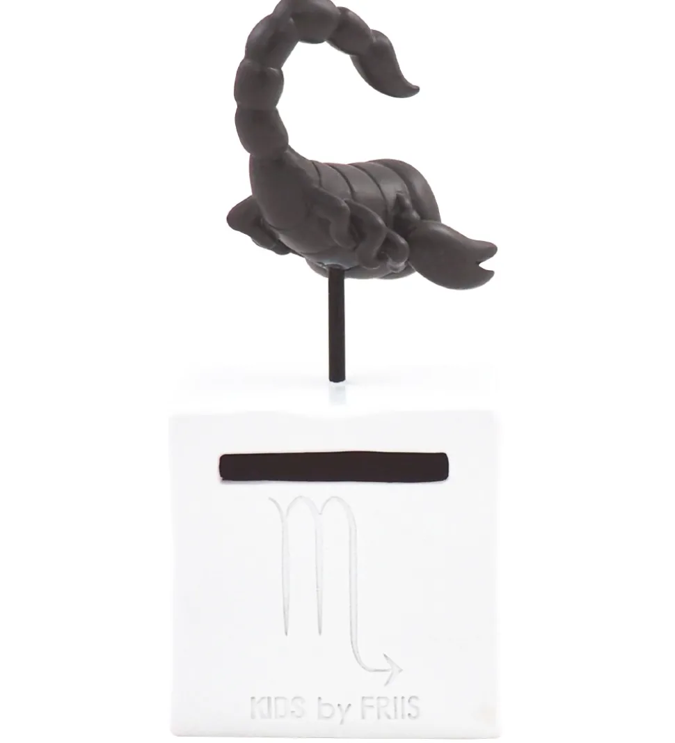Skøn Kids by Friis sparebøsse med stjernetegnet Skorpionen. Der er en sød figur af stjernetegnet oven på selve sparebøssen, der er udformet som en hvid kube.
