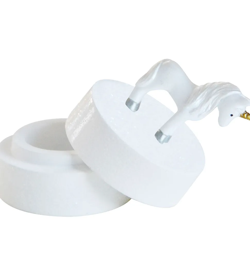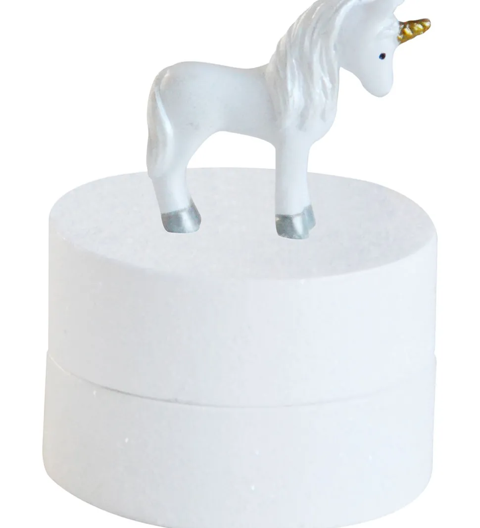 Fin Kids by Friis tandæske i hvid med fint glimmer. Ovenpå den runde æske står en flot enhjørning med sit skinnende guldhorn.