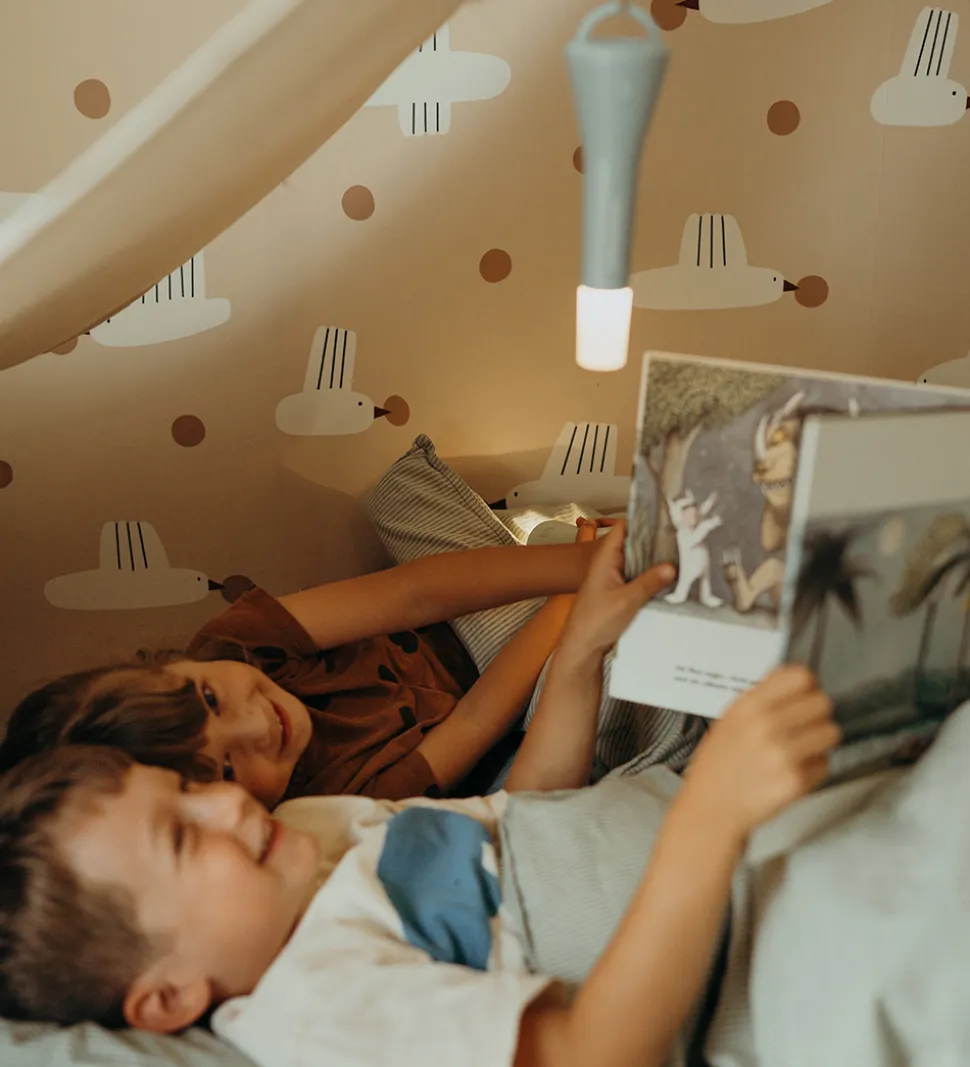 Kidywolf lommelygten kommer med 3 forskellige funktioner, samt 3 forskellige lysstyrker på 100, 60- og 20%. Den kan både bruges som en almindelig lommelygte, en stående lampe, og så har den en hank så man kan hænge lommelygten op og bruge den som lampe. Lommelygten har et funktionelt design, der gør den nem at bruge til leg og eventyr.