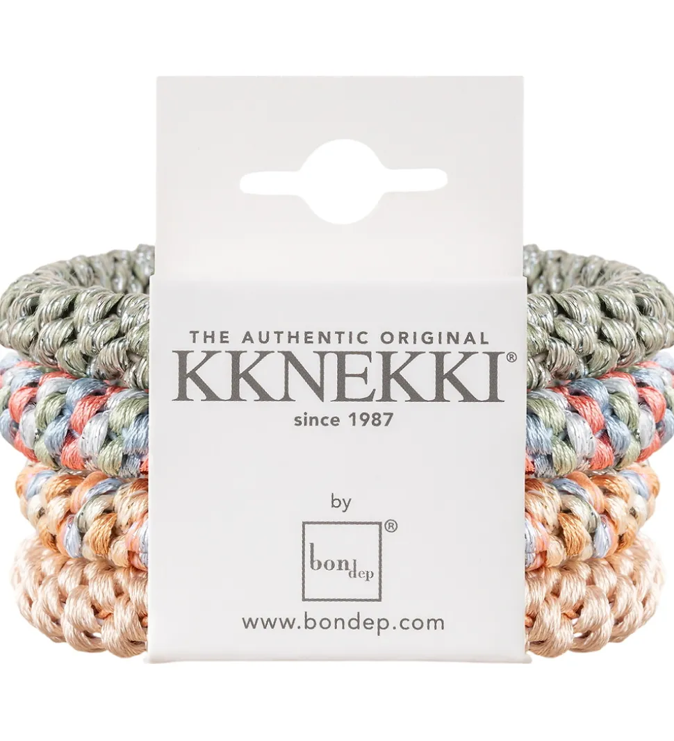 Kknekki hårelastikkerne består af mange smalle hårelastikker, som er strikket sammen med en masse tynde tråde. Hårelastikken fra Kknekki har en fantastisk, afrundet plastiksamling på midten der ikke river eller knækker hårene.
