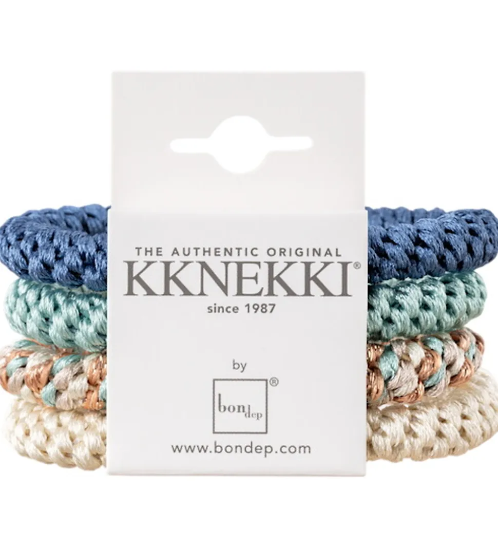 Kknekki hårelastikkerne består af mange smalle hårelastikker, som er strikket sammen med en masse tynde tråde. Hårelastikken fra Kknekki har en fantastisk, afrundet plastiksamling på midten der ikke river eller knækker hårene.