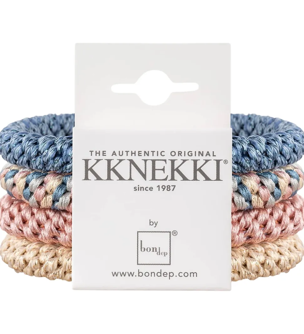 Kknekki hårelastikkerne består af mange smalle hårelastikker, som er strikket sammen med en masse tynde tråde. Hårelastikken fra Kknekki har en fantastisk, afrundet plastiksamling på midten der ikke river eller knækker hårene.