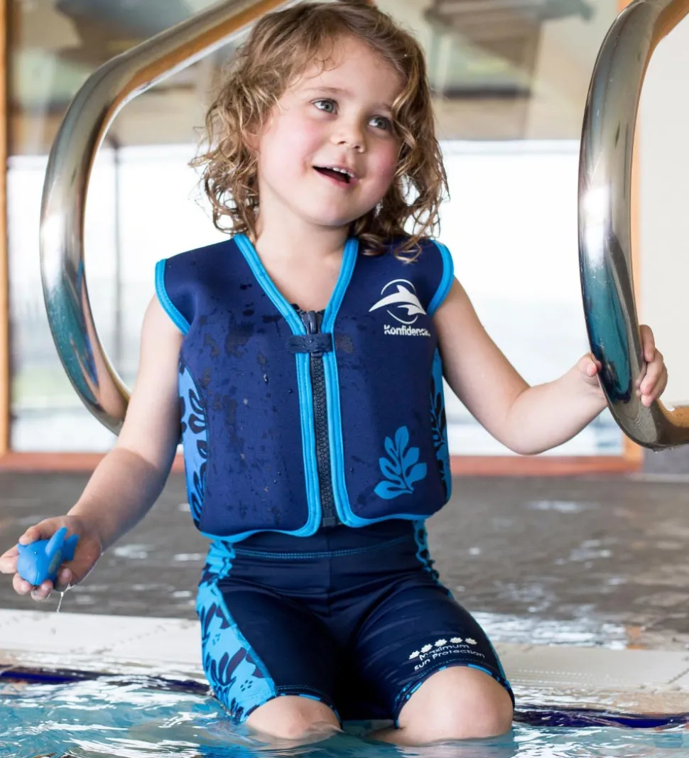 Lækker Konfidence svømmevest i rød med print af Konfidences velkendte delfinlogo på venstre bryst. Der står “The Original Konfidence Jacket” omme på ryggen, som er gul for at gøre svømmevesten synlig i vandet. Svømmevesten er fremstillet i blød og behagelig neopren, som er et fleksibelt materiale, der også er i våddragter. Neopren beskytter ligeledes mod solens UV-stråling, samtidig med den holder på barnets kropsvarme både i og ude af vandet.