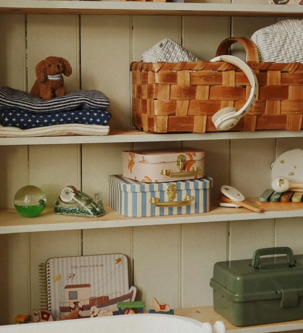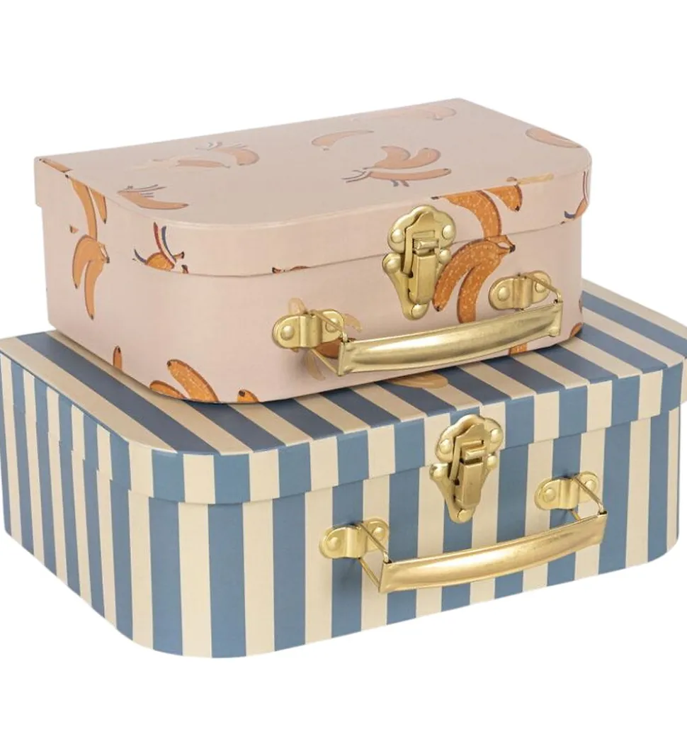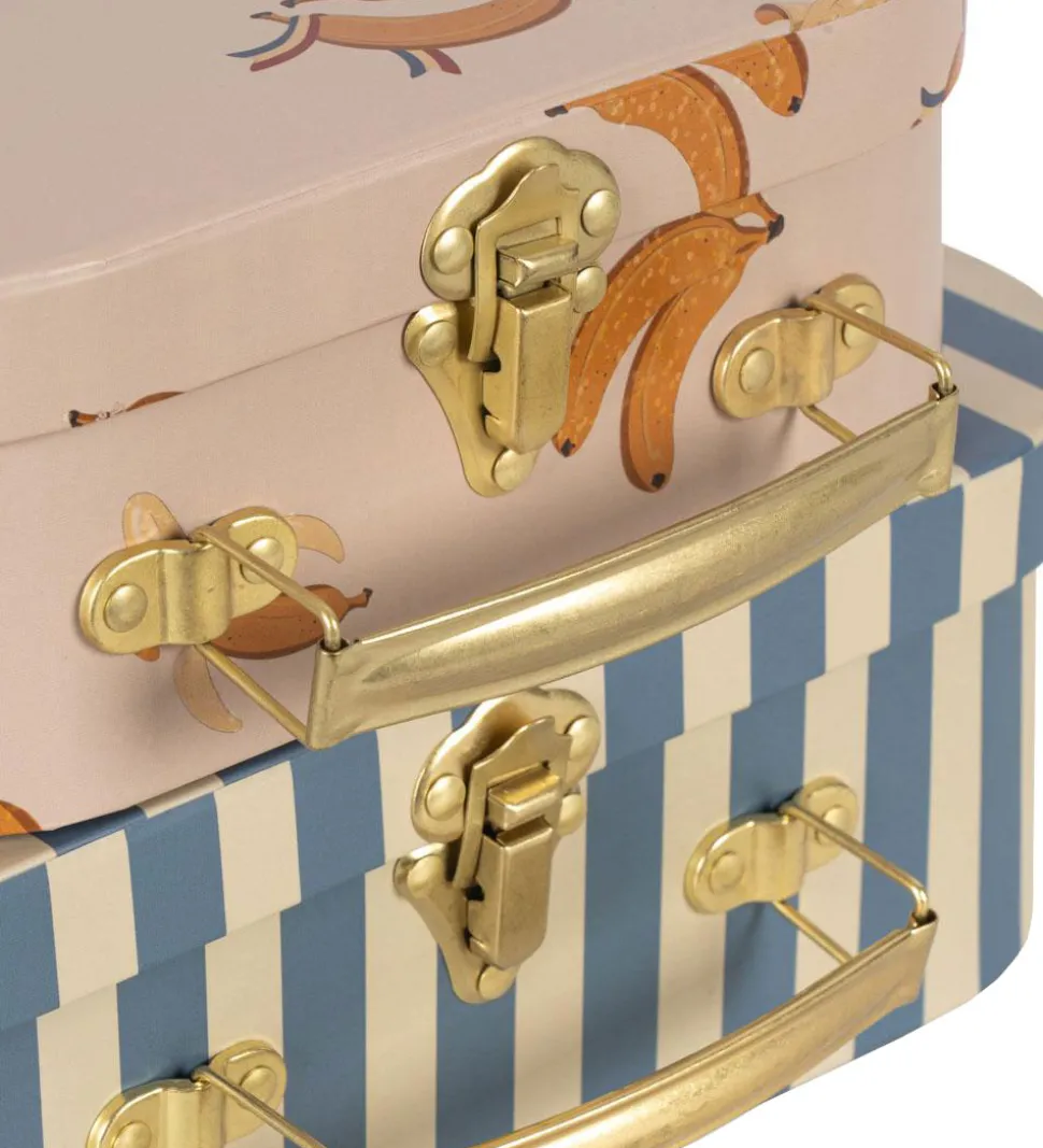 Konges Sløjd kuffertsættet består af to kufferter, som begge har et gyldent håndtag i toppen og åbnes med en metallås. Kufferterne er i tykt pap og er perfekte til opbevaring af f.eks. legetøj, eller når de små skal ud på tur. Den lille kuffert kan være inde i den store.