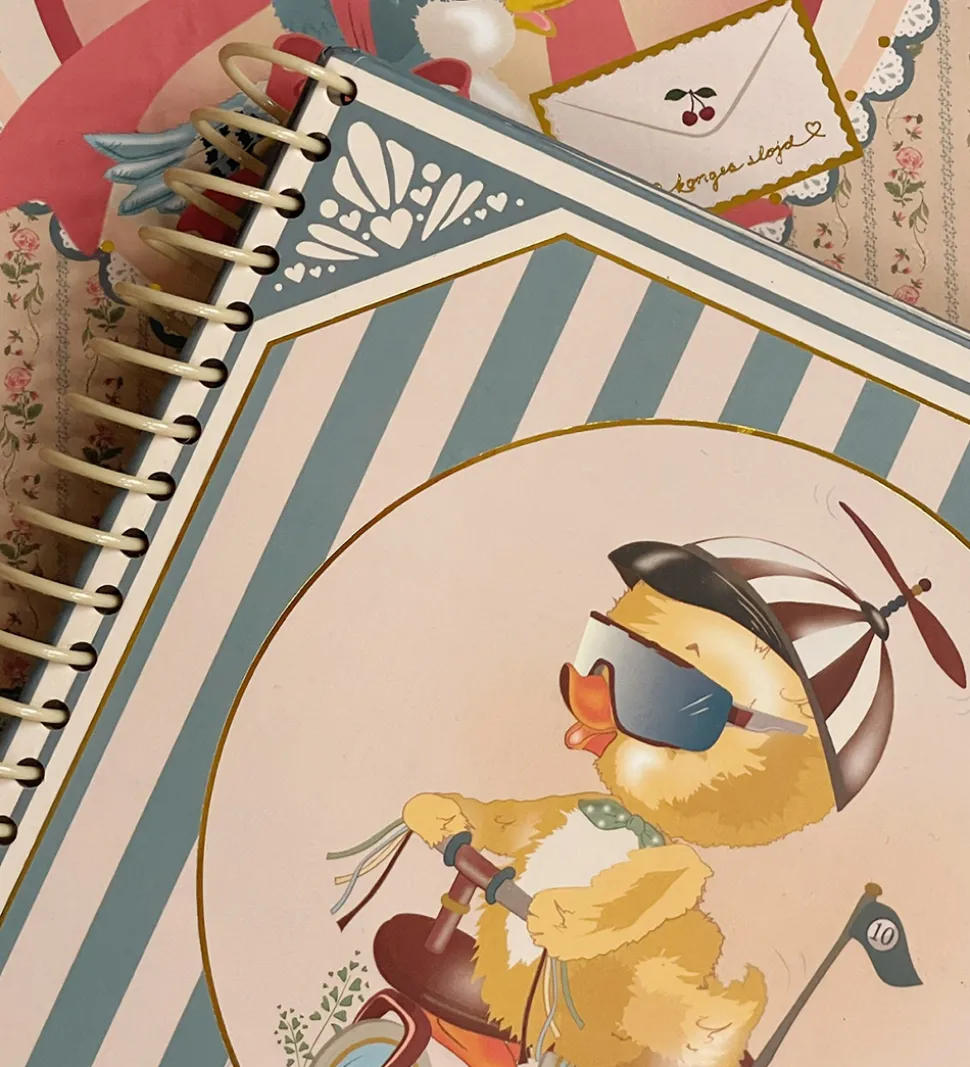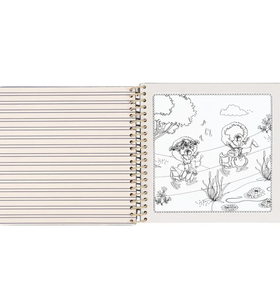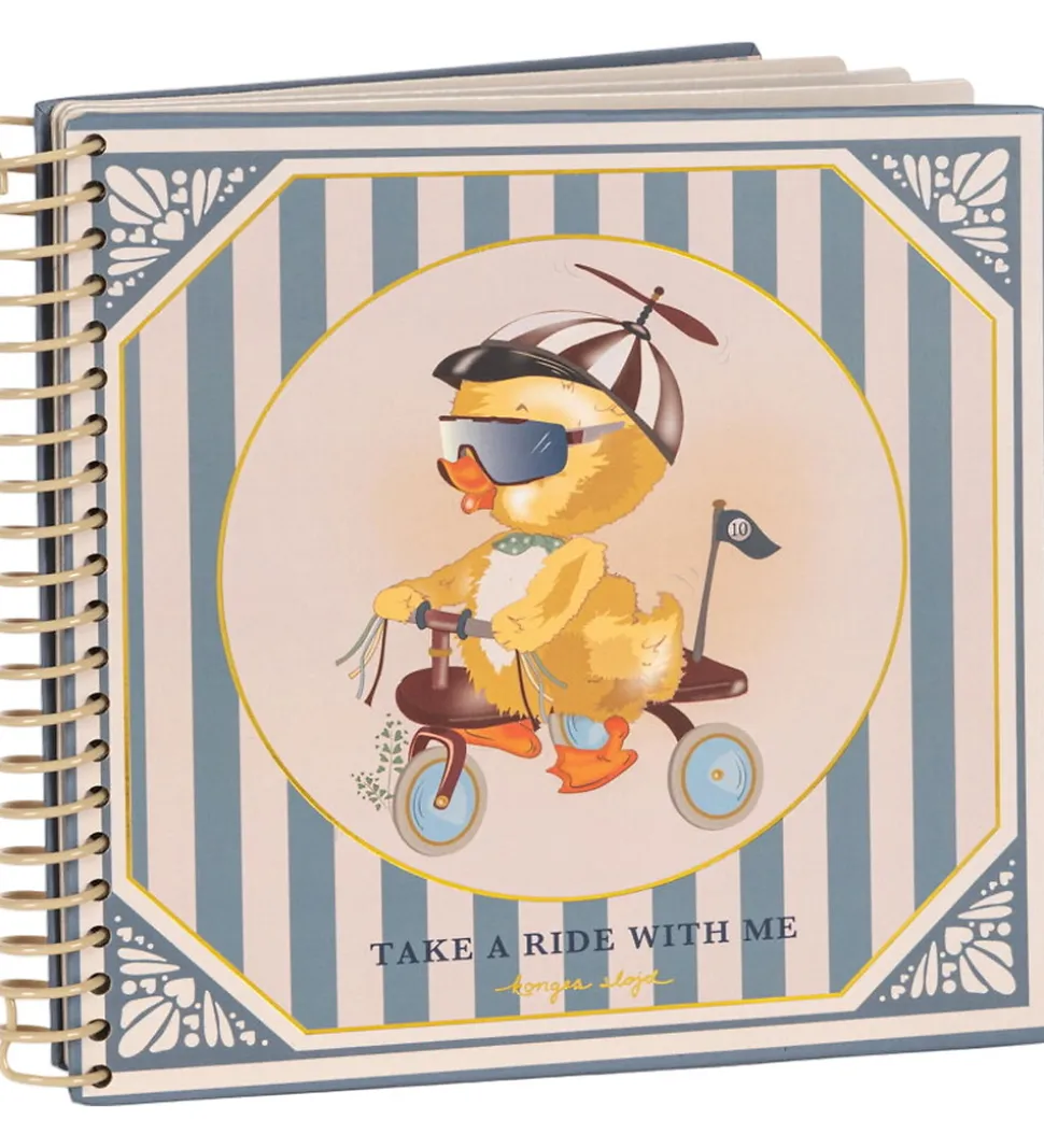 Flot malebog fra Konges Sløjd i beige med blå striber og en ælling på cykel.