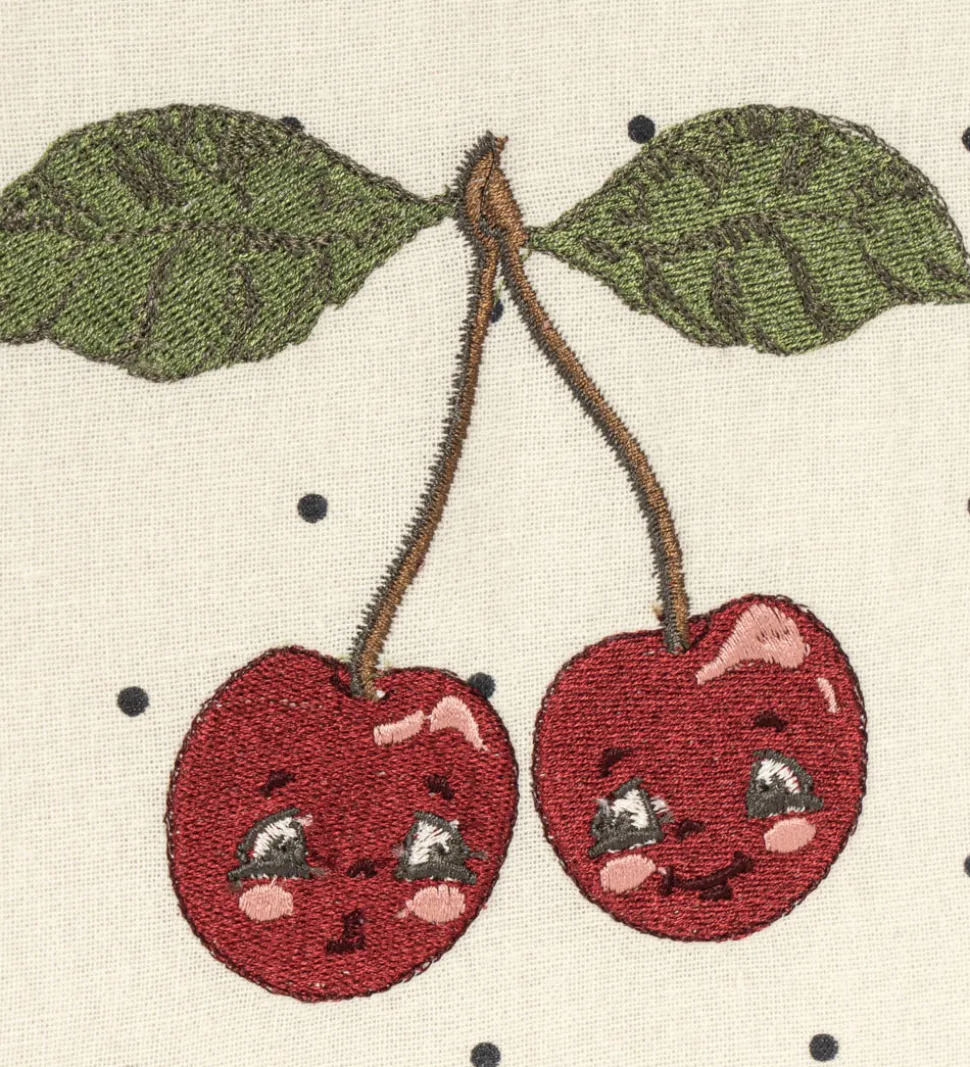 Fin Konges Sløjd opbevaringskurv i hvid med prikker, og på den ene side er der røde kirsebær. Låget er ensfarvet hvidt.