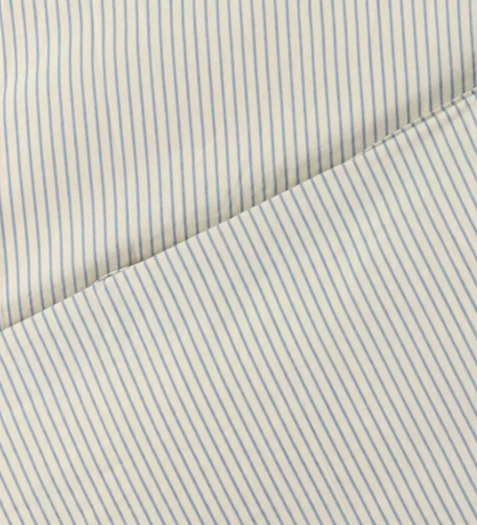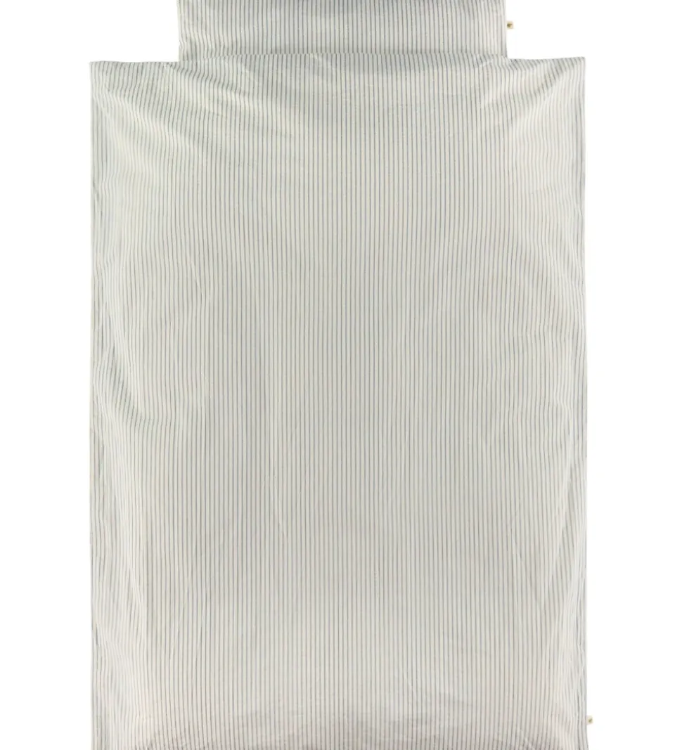 Lækkert Konges Sløjd sengetøj i råhvid med smalle, blå striber. Konges Sløjd sengetøjet består af et hovedpudebetræk med foldelukning, og et dynebetræk som lukkes med lynlås i enden. Sengetøjet er fremstillet i blødt, økologisk bomuld, og kommer i en smart opbevaringspose.
