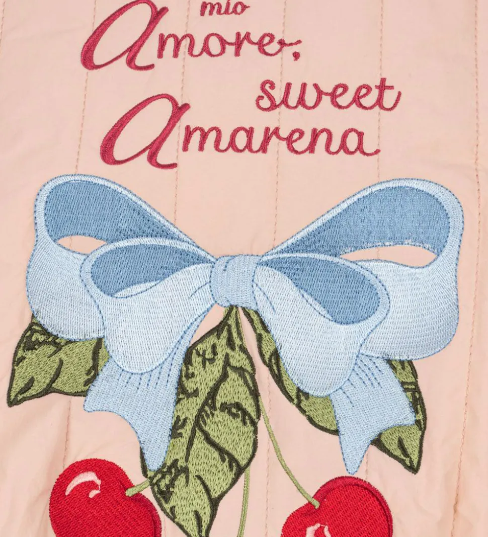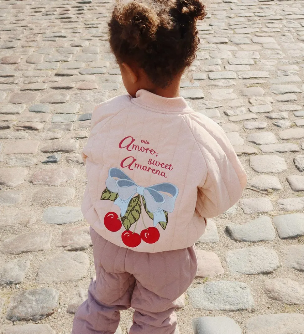 Smart Konges Sløjd termojakke i qulitet lyserosa, og med en broderet sløjfe på venstre bryst samt en stor, broderet sløjfe og kirsebær på ryggen.