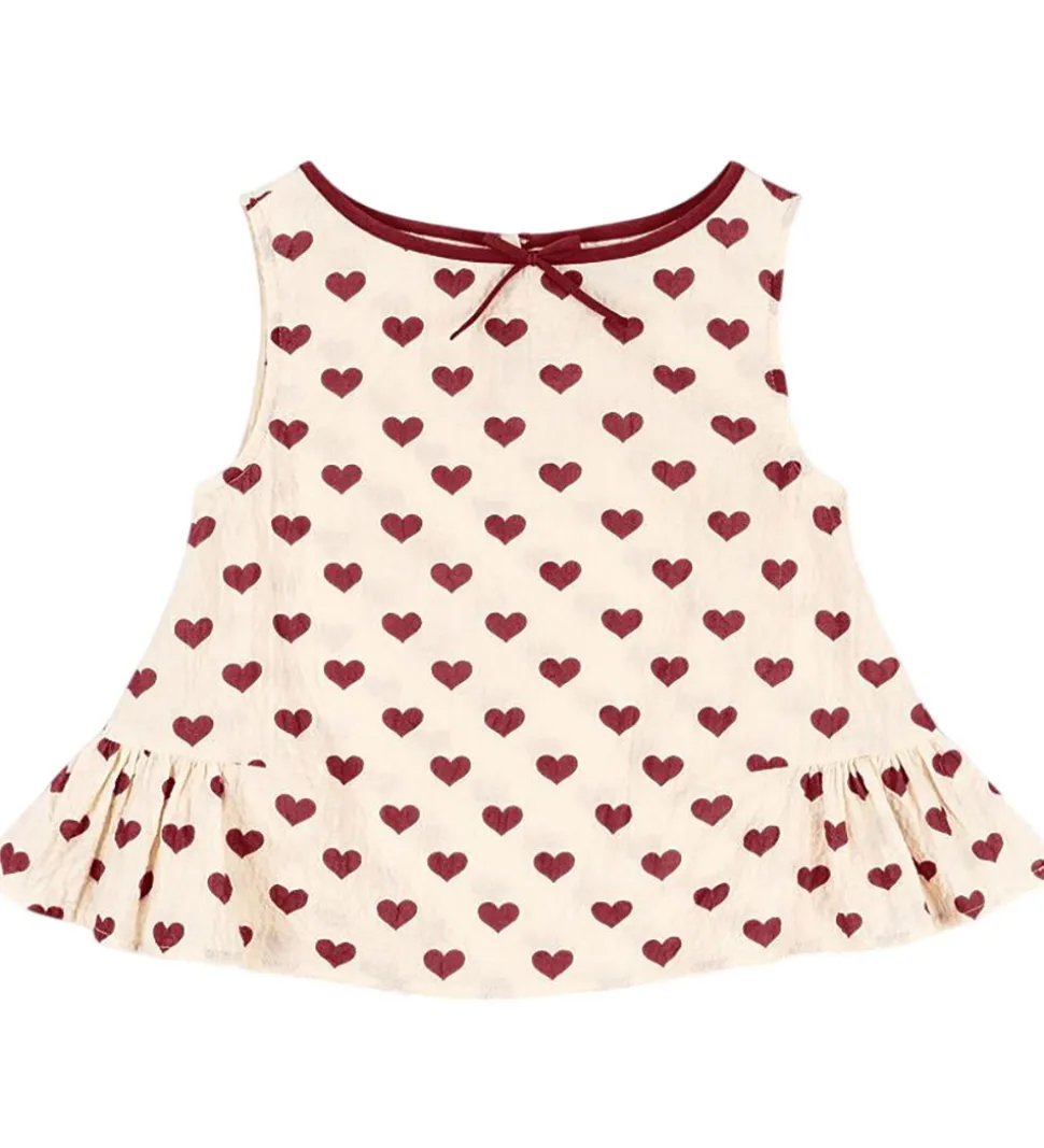 Charmerende Konges Sløjd top i en lys, beige nuance med små hjerteprints i rød. Toppen har en klassisk, rund halsudskæring med en fin sløjfe, som tilføjer et sødt touch. De lette flæsedetaljer nederst bidrager til en fin og elegant stil.