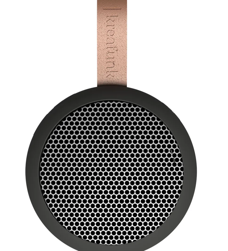 Lækker Kreafunk højtaler i et sort farvetema med en brun læderstrop.