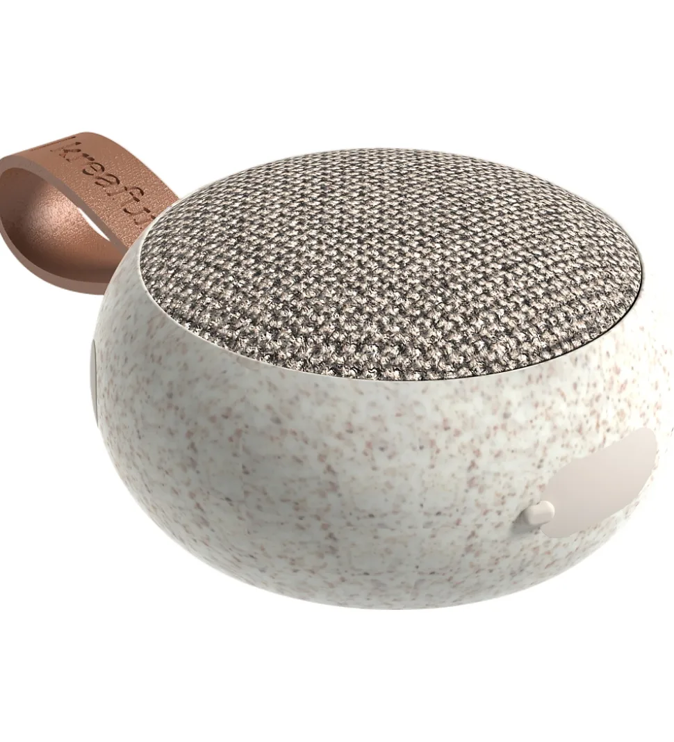 Skøn Kreafunk højtaler i meleret beige med en brun læderstrop.