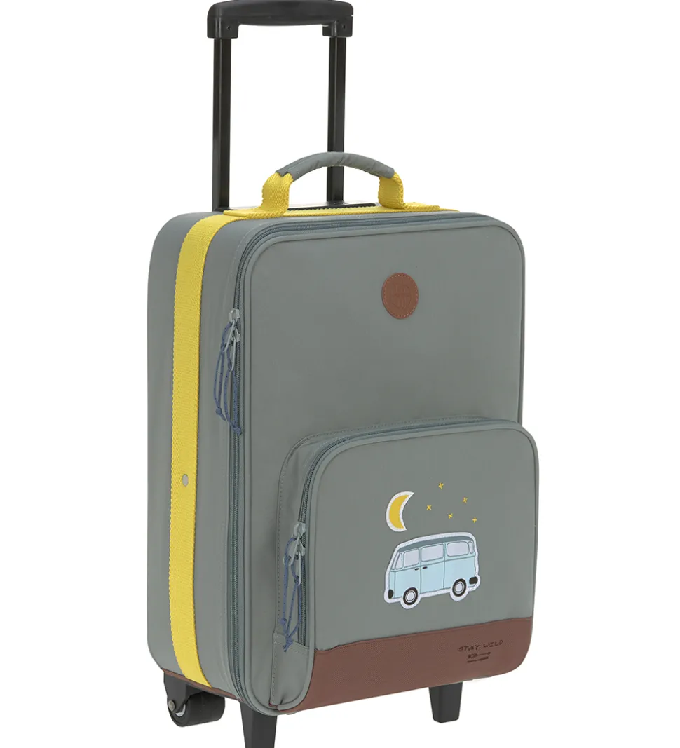 Praktisk Lässig kuffert i en flot blågrøn farve med sjovt camperprint på fronten.