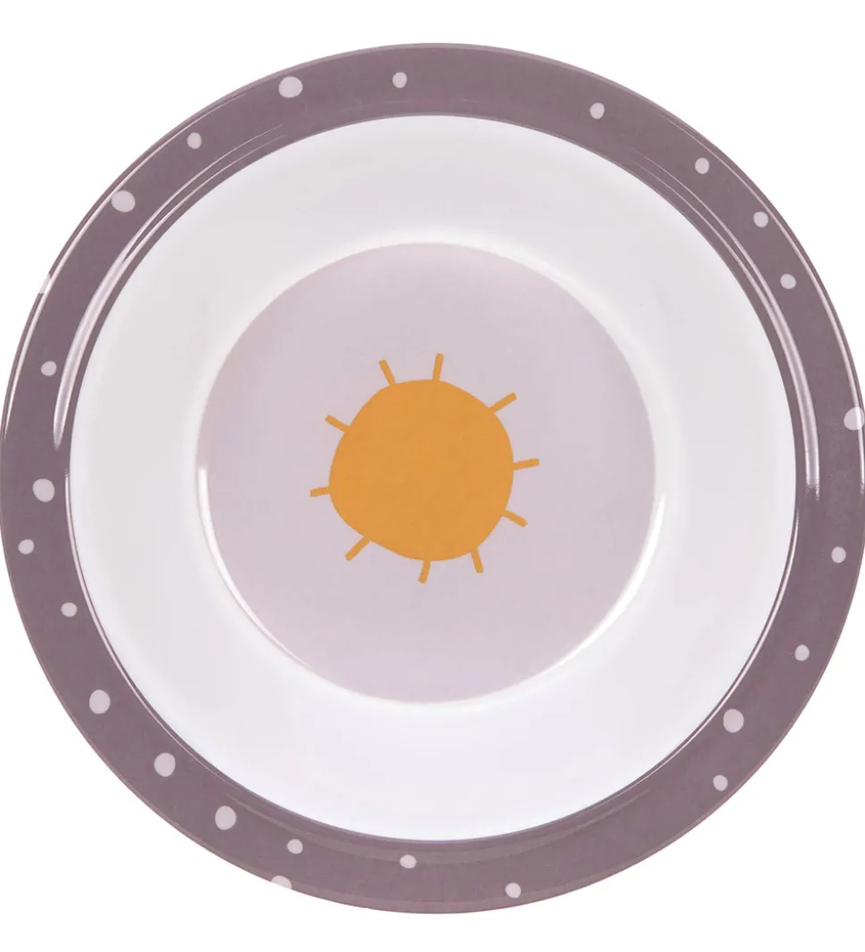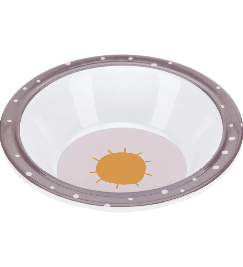 Praktisk Lässig skål i hvid med en fin lilla kant med hvide prikker, samt en lilla bund med en flot sol.