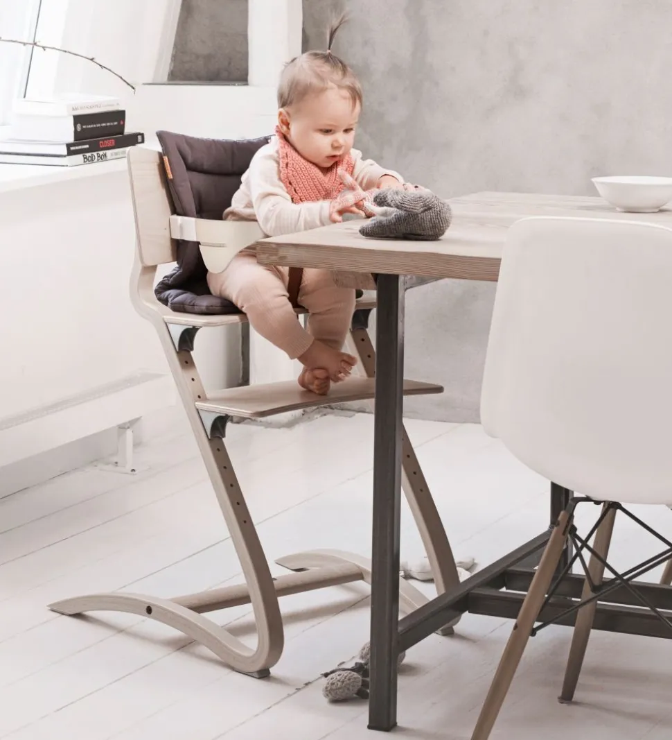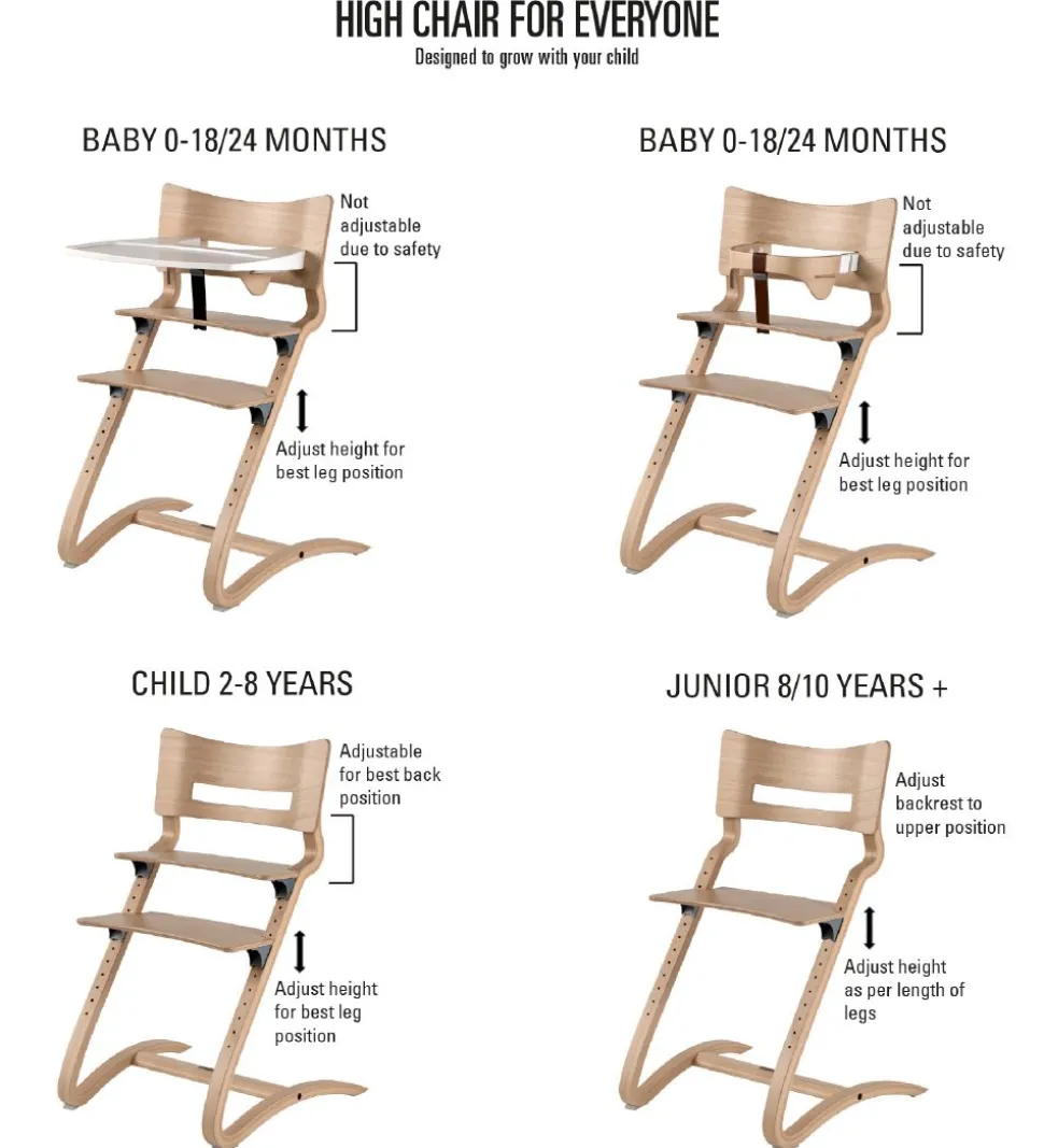 Leander højstolen støtter barnet i ryggen, og både rygpladen, siddepladen og fodstøtten kan justeres i højden, så stolen kan tilpasses det enkelte barn, og samtidig kan den vokse med barnet. Og hvis du bytter om på siddepladen og fodpladen, passer stolen perfekt til en voksen.