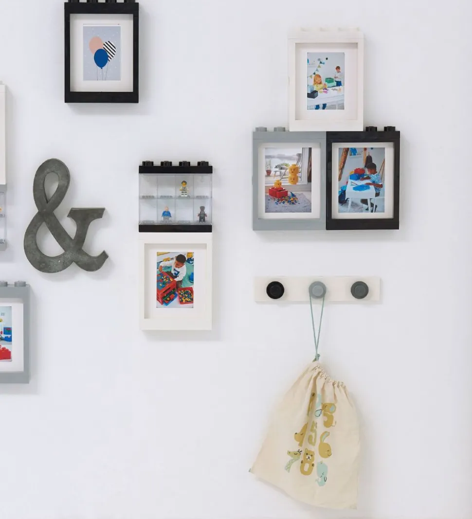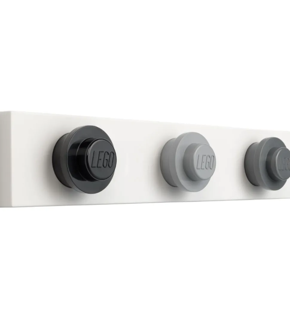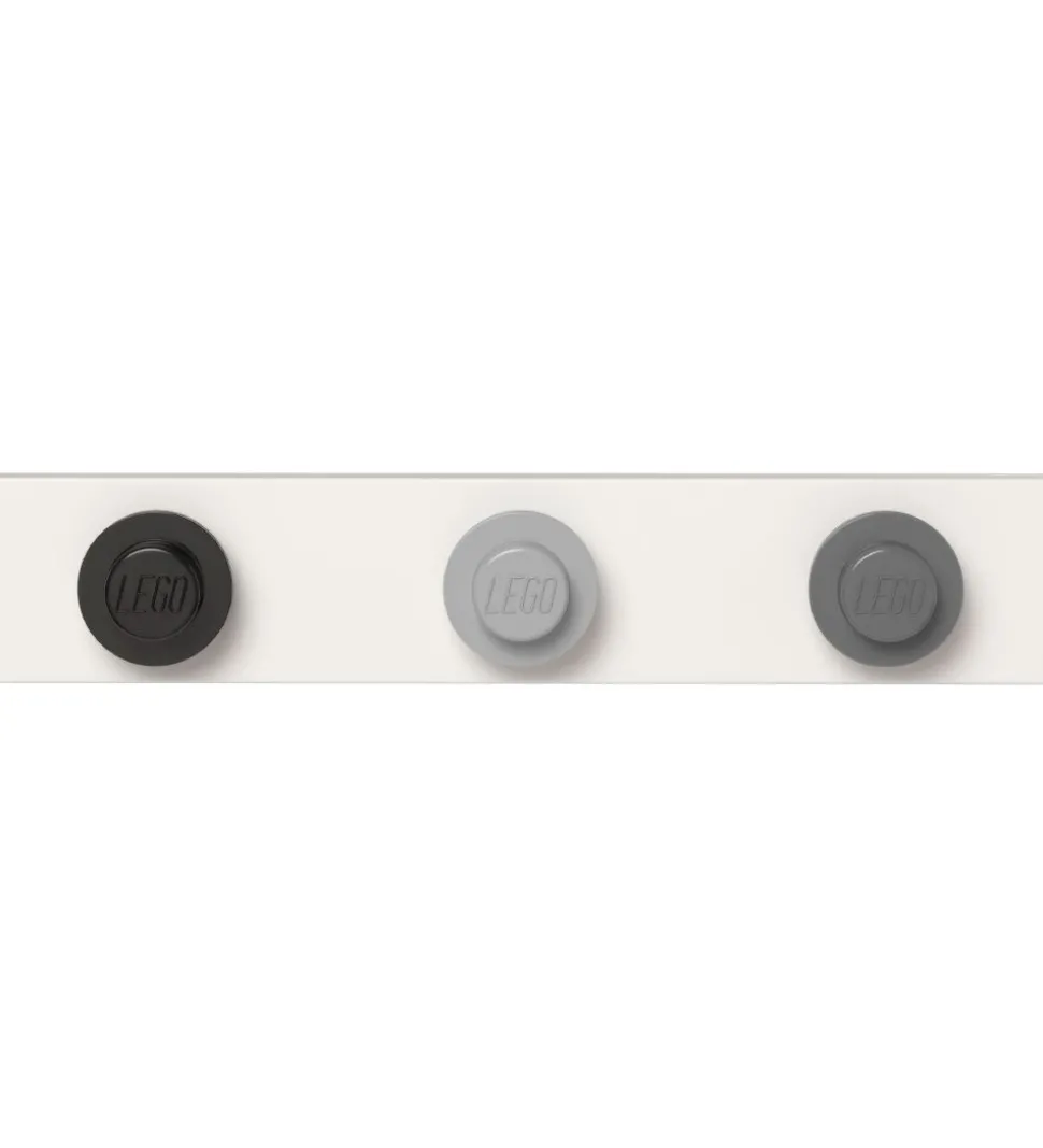 Flot LEGO® Storage knagerække i hvid med knopper i sort, grå og mørkegrå.