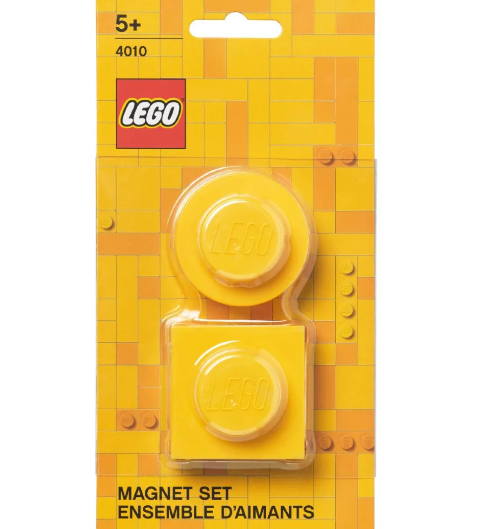 Smukke LEGO® Storage magneter i gul i en rund og firkantet form med en knop på toppen.