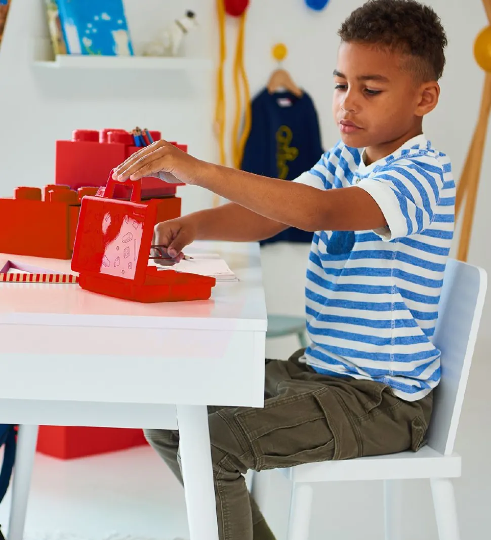 Fin LEGO® Storage rejsekuffert i rød plast med et allover mønster af LEGO® klodser.