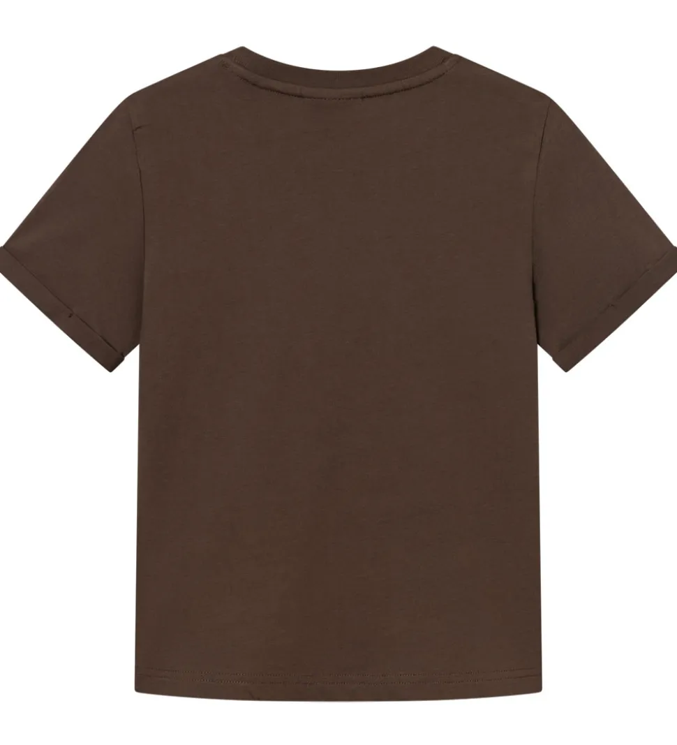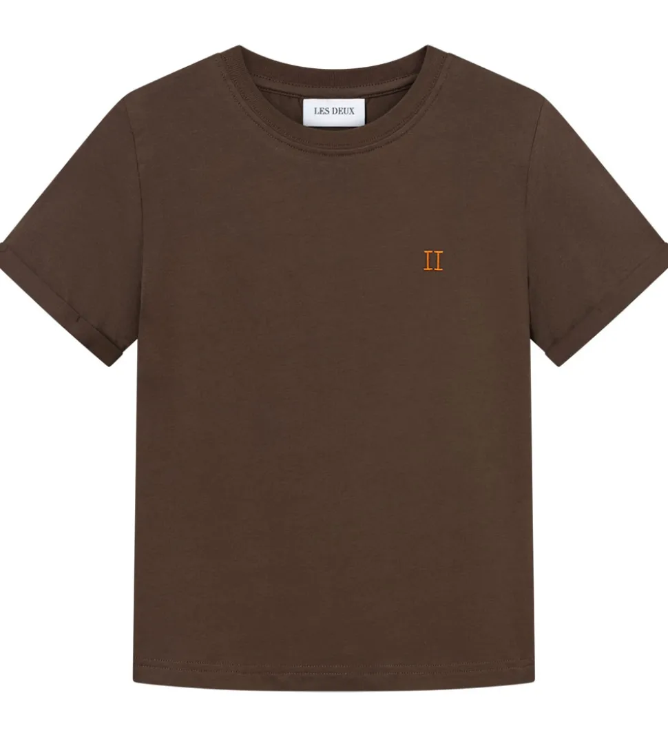 Elegant Les Deux t-shirt i en dyb, brun nuance. T-shirten har et minimalistisk udtryk med en enkel broderet “II” på brystet i en kontrasterende gul farve. Les Deux t-shirten har en rund halsudskæring og korte ærmer, hvilket gør den klassisk i sit design.