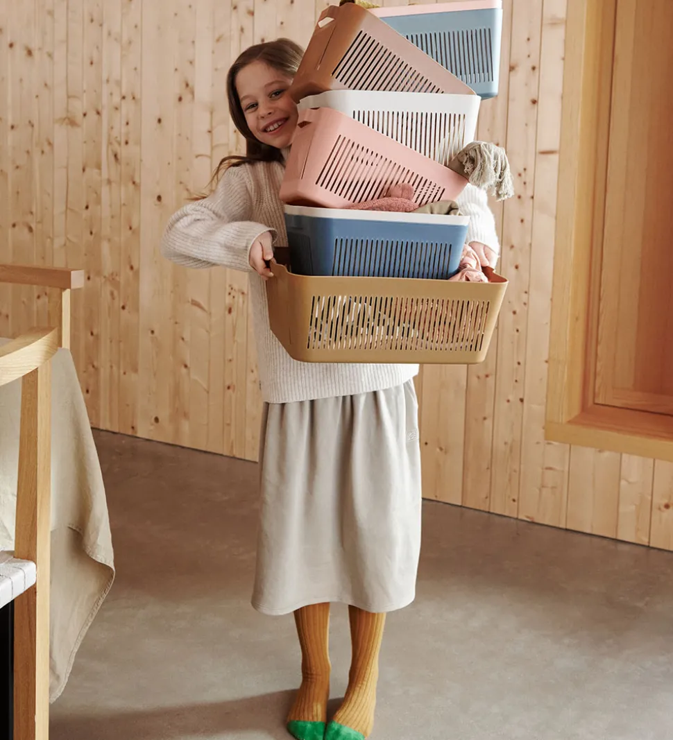 Liewood kurven har et praktisk håndtag i begge sider, så de er lette at løfte på. Kurvene kan stables i hinanden, så de er lette at opbevare når de ikke er i brug. Kurvene kan f.eks. bruges til legetøj eller på badeværelset.